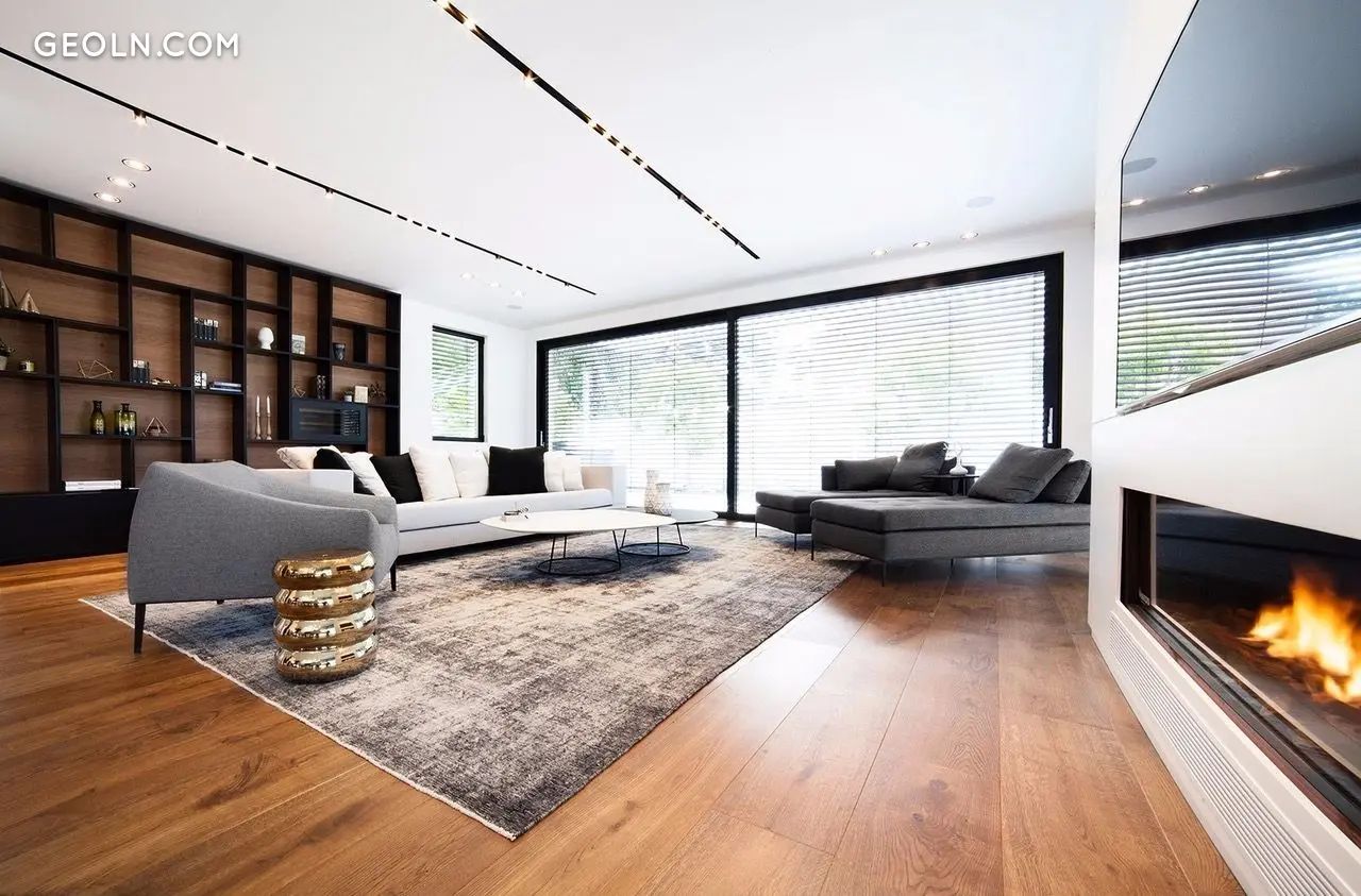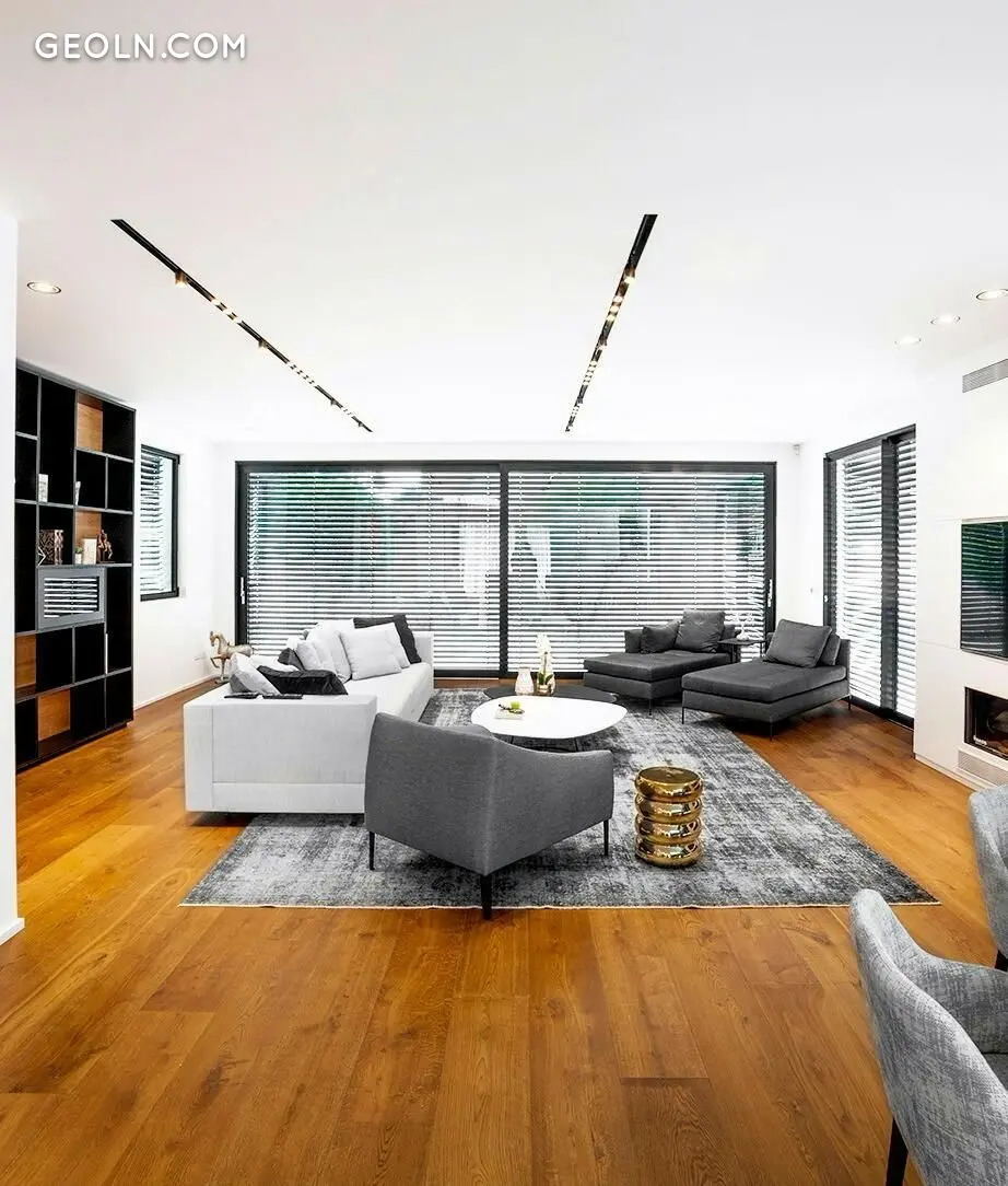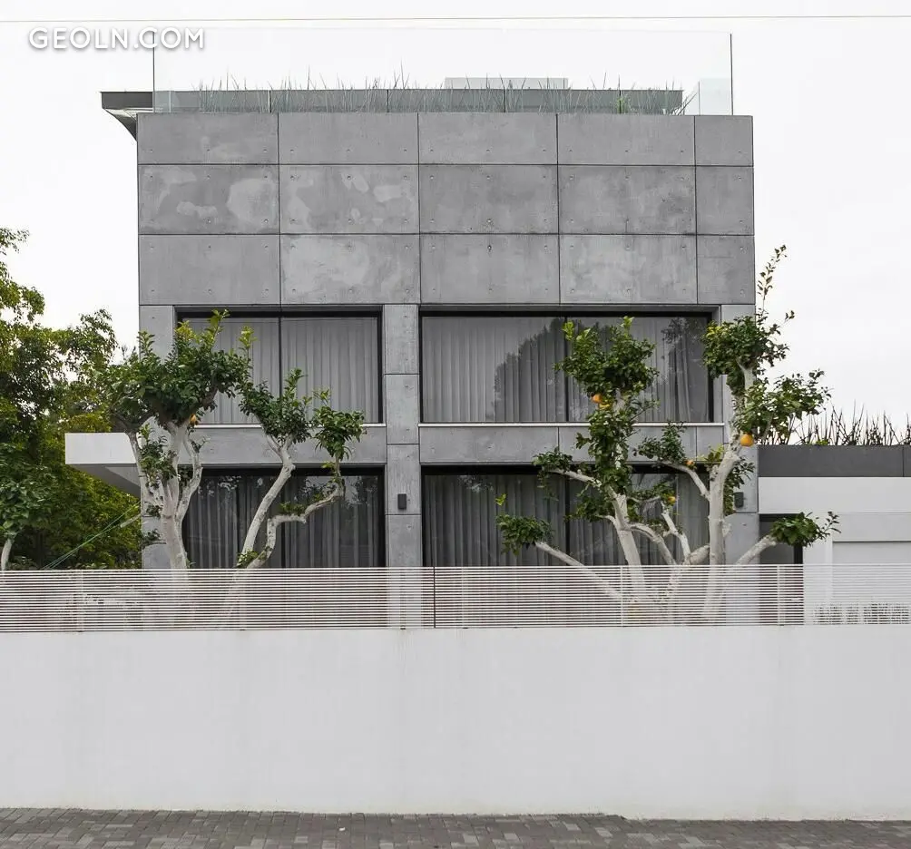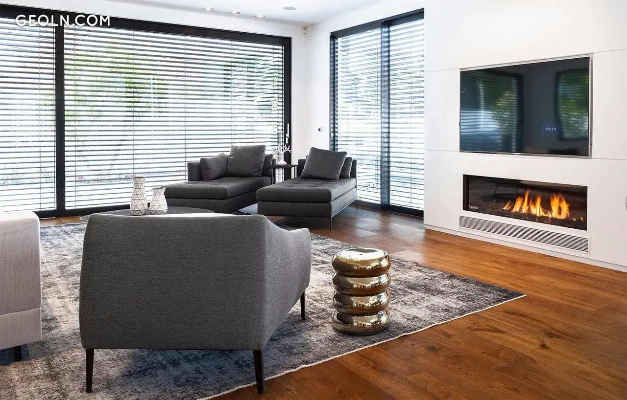 בית של 350 מ"ר, 5 חדרי שינה עם שירותים, מטבח מודרני פנטסטי עם אור כפול, סלון נעים מאוד עם אח. חלונות גדולים מהרצפה עד התקרה מעולים לאקלים הישראלי, פותחים אפשרות לחבר את פנים הבית עם הגינה ויוצרים תחושת מרחב. שילוב מעניין של חומרי גימור נותן תחושה של חמימות וקרירות בו זמנית. מאוד נעים ויפה.