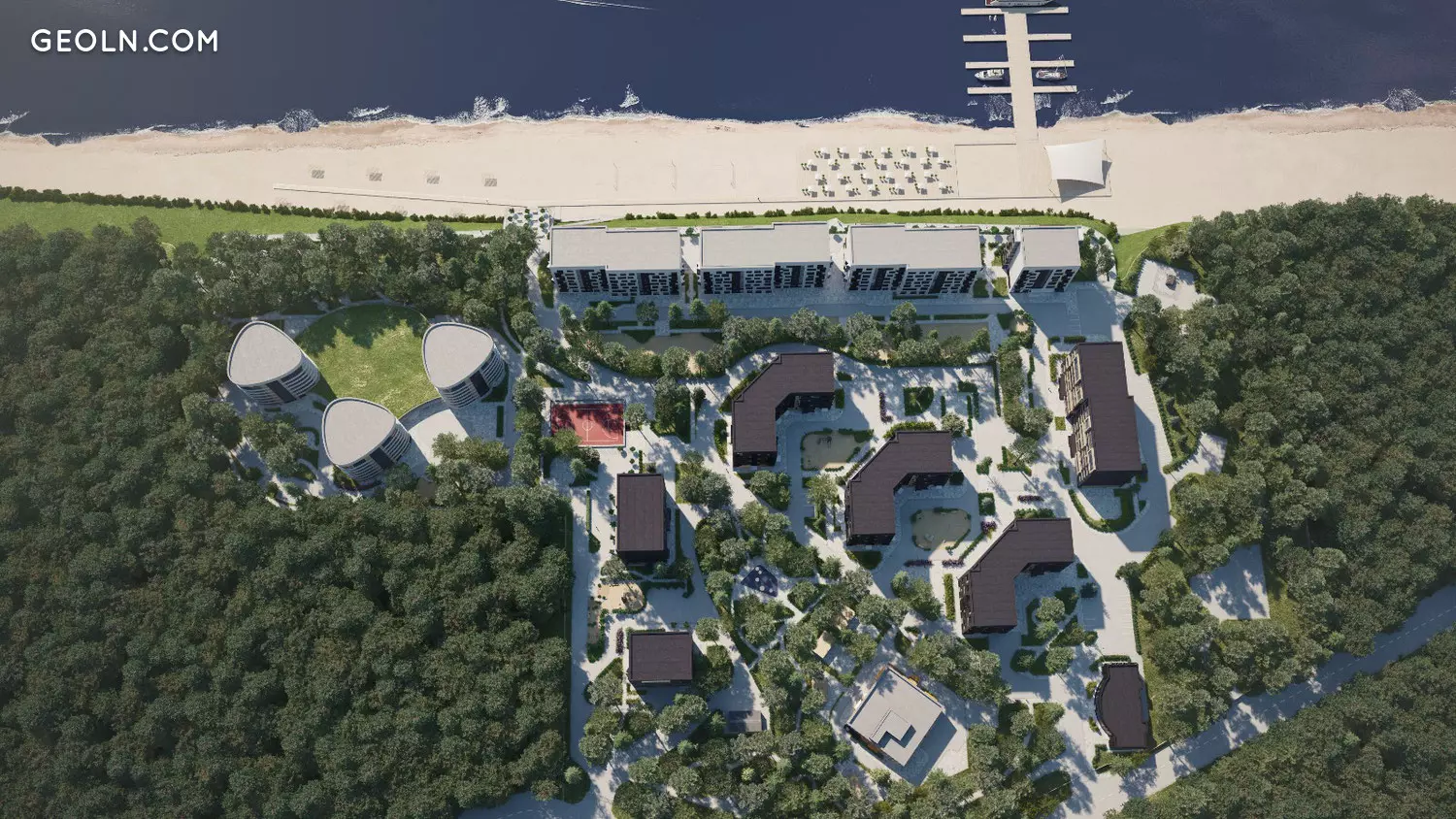 בתי הרובע האקולוגי מאופיינים בארכיטקטורה יוצאת דופן. בתכנית הם בצורת משולשים עם פינות מעוגלות. בסך הכל המתחם כולל שלוש עשרה בניינים חדשים בני שמונה קומות. מספר קומות הבתים מכוון לגובה היער המקיף את המתחם.