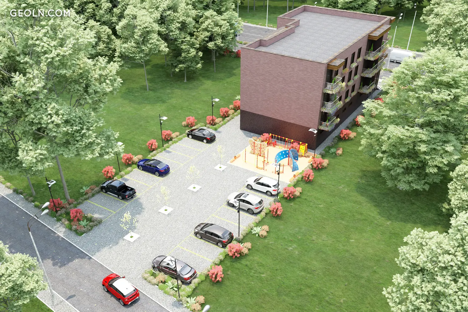 בניין נמוך עם שלוש כניסות, בקומת הקרקע חלק לנדל"ן מסחרי. הסדרת מקומות חניה בודדים אפשרית בהסכמה עם היזם.