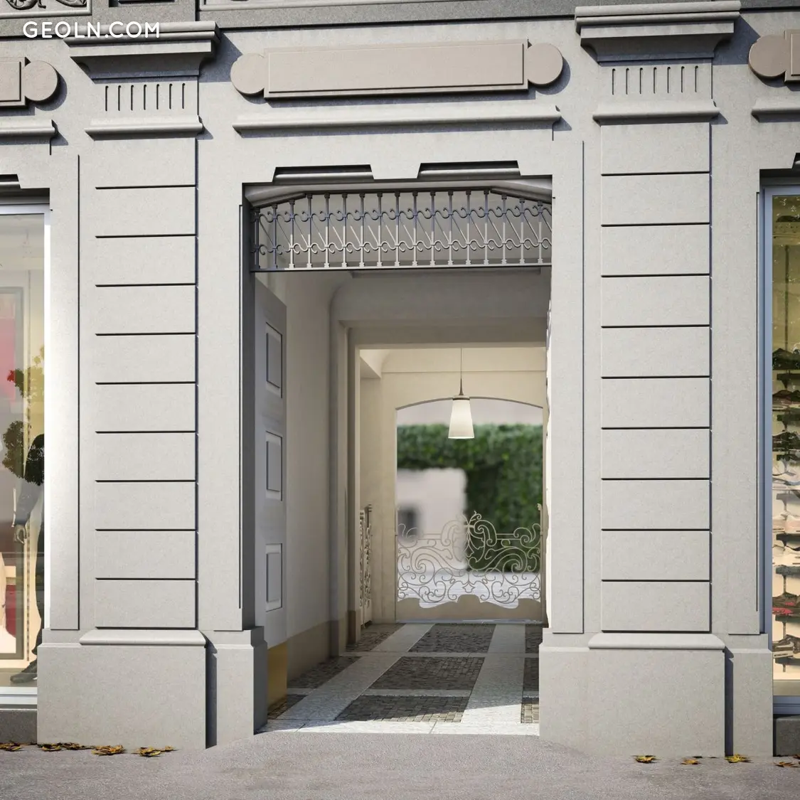მთავარი შენობა, რომელიც გადაჰყურებს პიაცას სანტა მარია დელ სუფრაჯოს, ეზოთ და კერძო მიწისქვეშა ავტოფარეხებით. საუკუნის დასაწყისის დამახასიათებელი არქიტექტურა ნაგებობას სხვებისგან განასხვავებს, ის განსაკუთრებით შესამჩნევია გარე ფასადებზე იმ ეპოქის მამულების ტიპიური ყვავილოვანი საზღვრებით. შენობის მთავარი შესასვლელი არის პიაცა სანტა მარია დელ სუფრაჯიოდან თეთრი ჭრელი რკინის კარიბჭით.