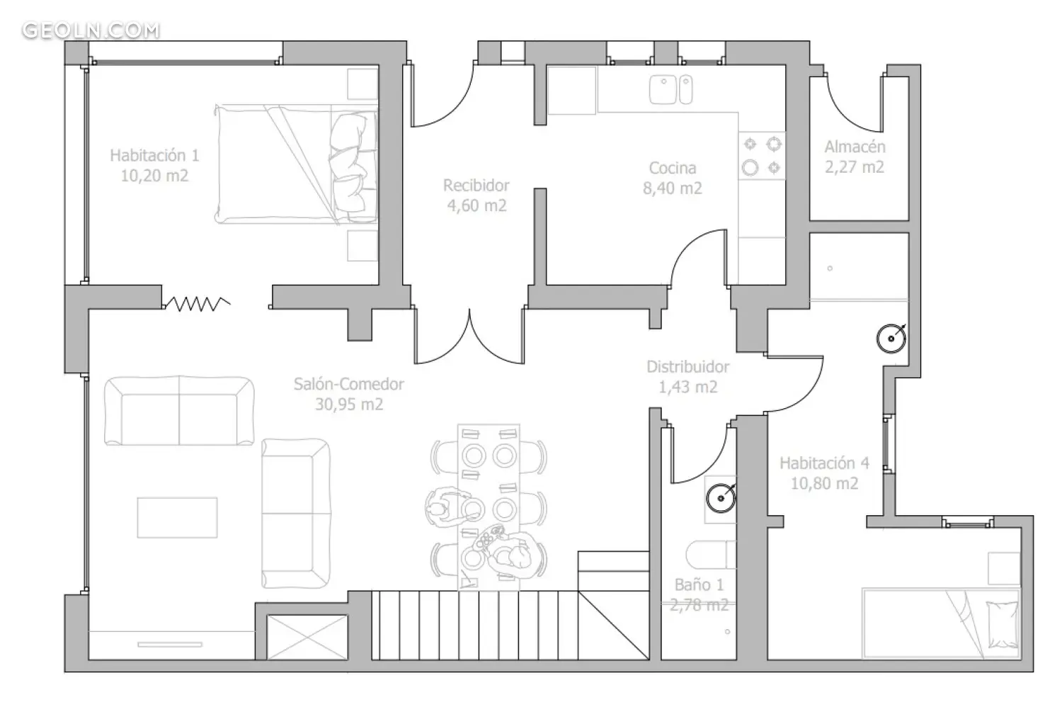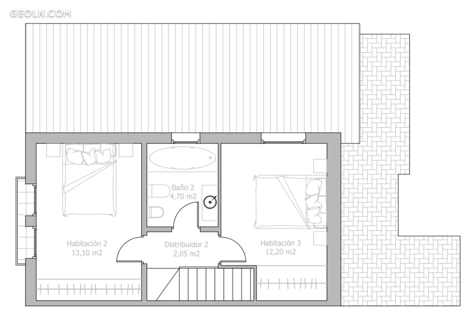 მეორე სართულზე მდებარეობს ღამის ზონა; ორი საძინებელი ორმაგი საწოლებით და ინტეგრირებული კარადებით, ერთი მათგანი ბალკონით; და აბაზანა აბაზანით.