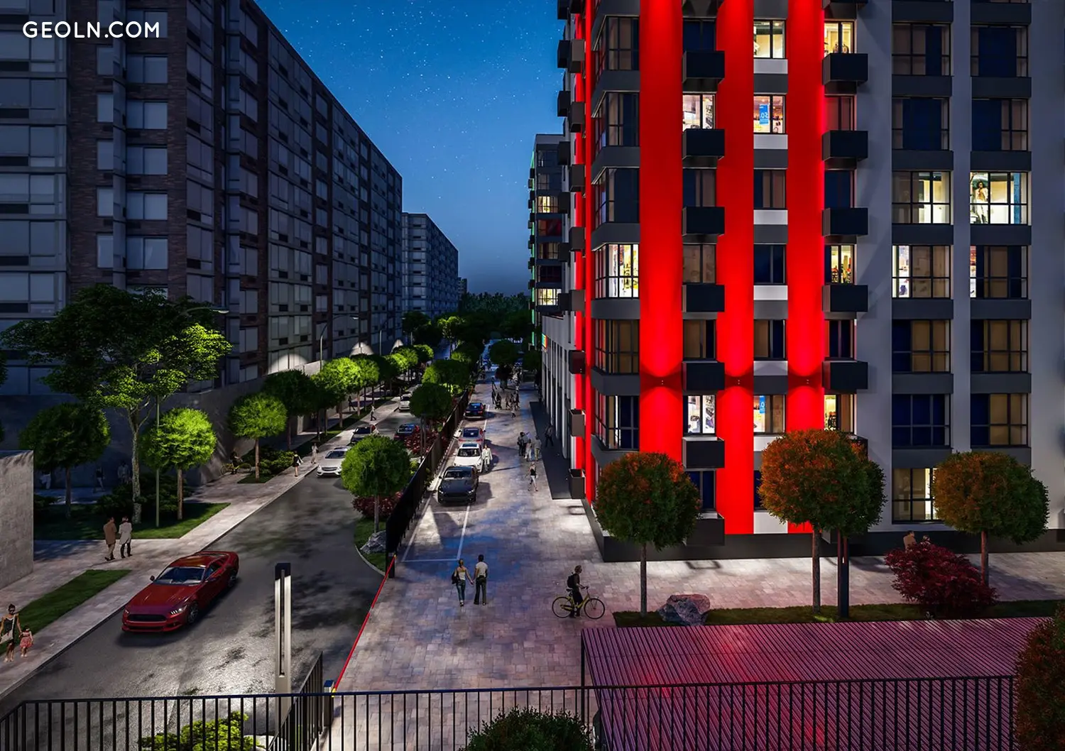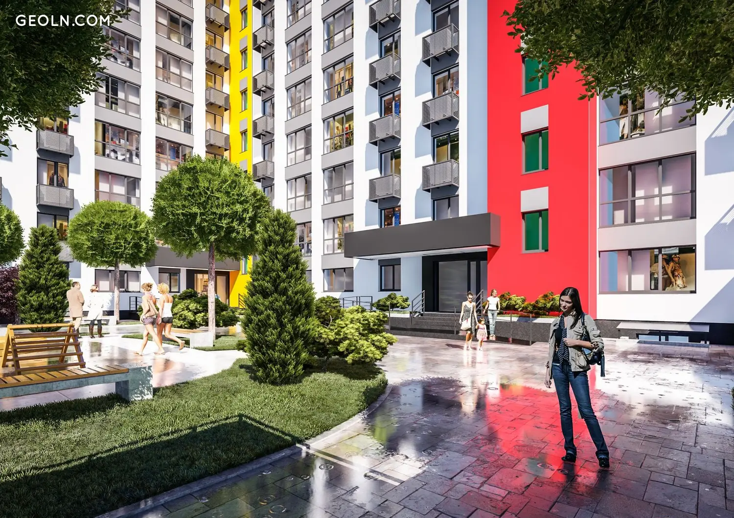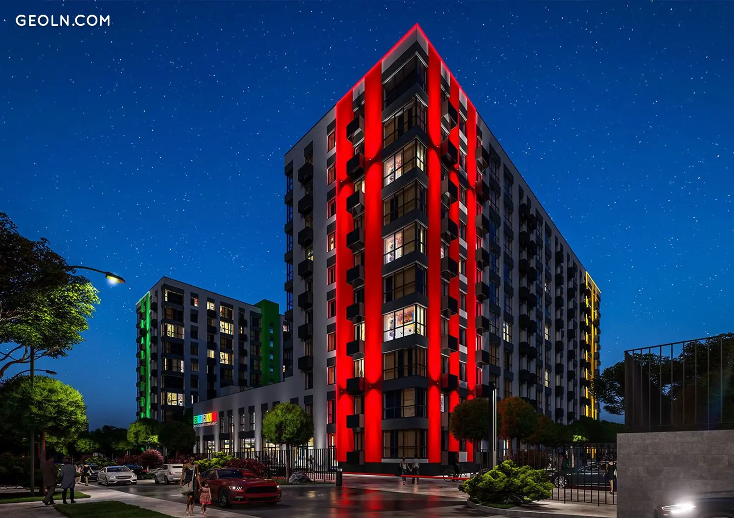 ფასადების მკაფიო გეომეტრიული ფორმები ხაზგასმულია დეკორაციის ნათელი კონტრასტული ფერებითა და ღამით - არქიტექტურული განათებით. მომიჯნავე ტერიტორიის მოწყობის პროექტი ითვალისწინებს განათების, ასფალტირებული საცალფეხო შესახვევებისა და პარკირების ადგილებს კომპლექსის გარედან.
