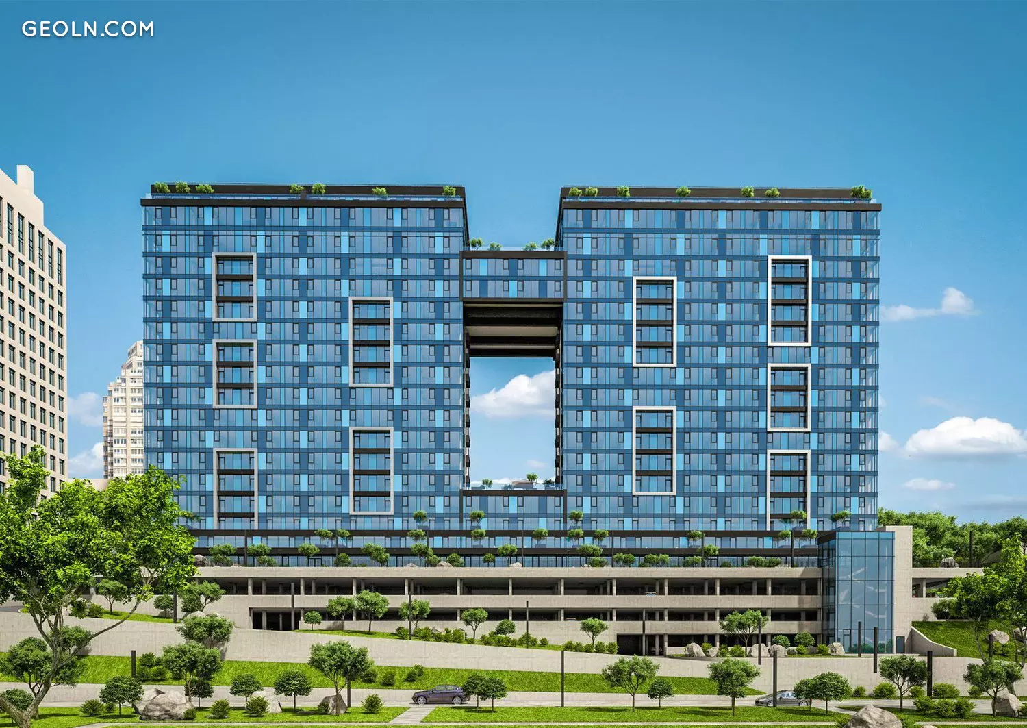 სამ დონის მიწისქვეშა პარკინგი, რომელზეც ლიფტი დგას სახლის ბოლო სართულზე.