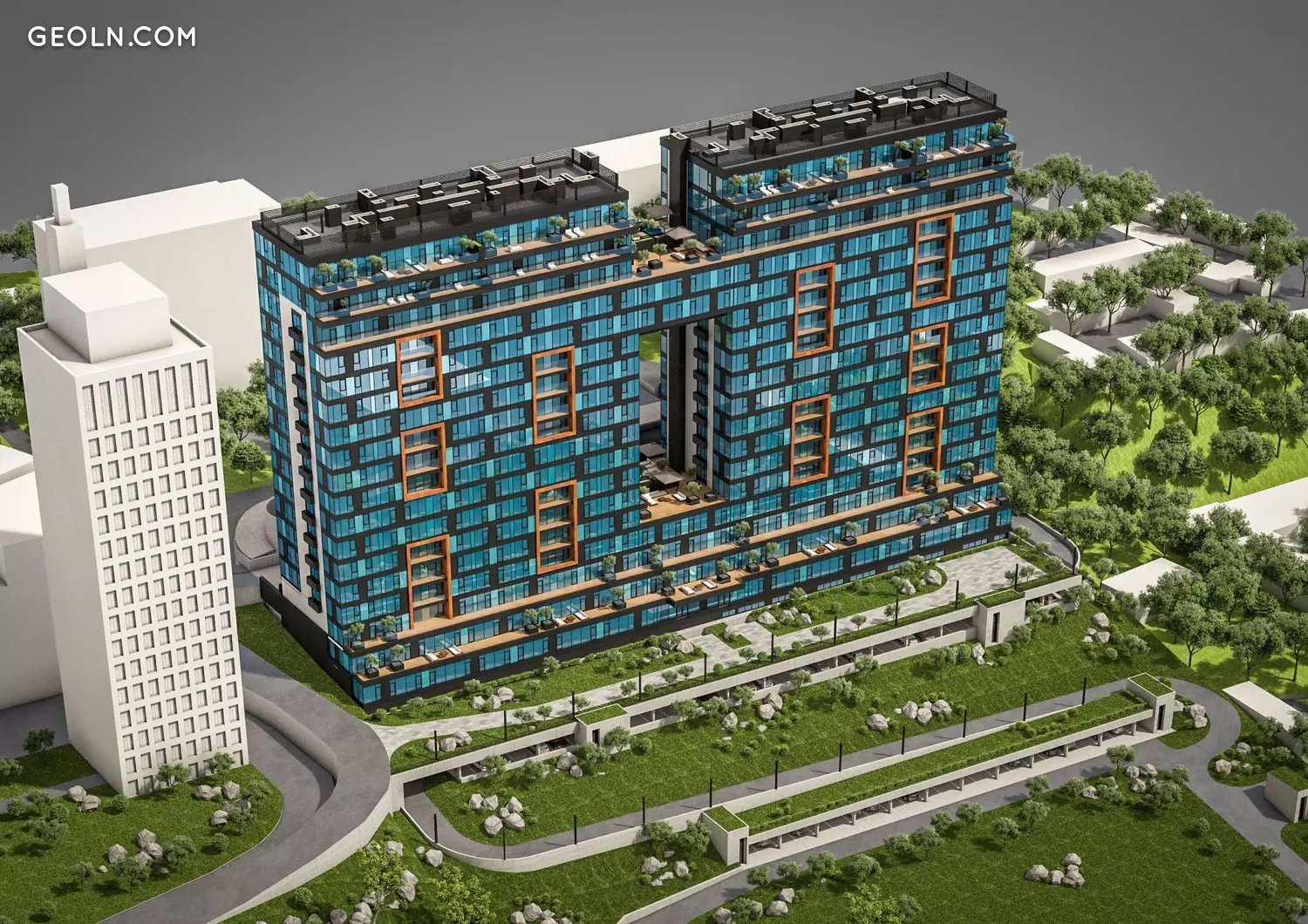 Nebo საცხოვრებელი კომპლექსი დნეიფერის ნაპირზე მდებარეობს, რომლის ხედი იხსნება ახალი კორპუსის პანორამული ფანჯრებით. მან ერთი სახურავის ქვეშ გააერთიანა კომფორტული თავისუფალი დონის აპარტამენტები, ექსკლუზიური პენატრები ზედა სართულებზე, საკუთარი ტერასული მოედანი, საბავშვო და სპორტული მოედნები. მოდური მაღაზიები განთავსდება კომპლექსის პირველ სართულზე, ხოლო ქვედა სართულზე განთავსებულია სამ დონის მიწისქვეშა პარკინგი, სადაც უფრო მეტი ავტოსადგომია, ვიდრე კომპლექსში არის ბინები.