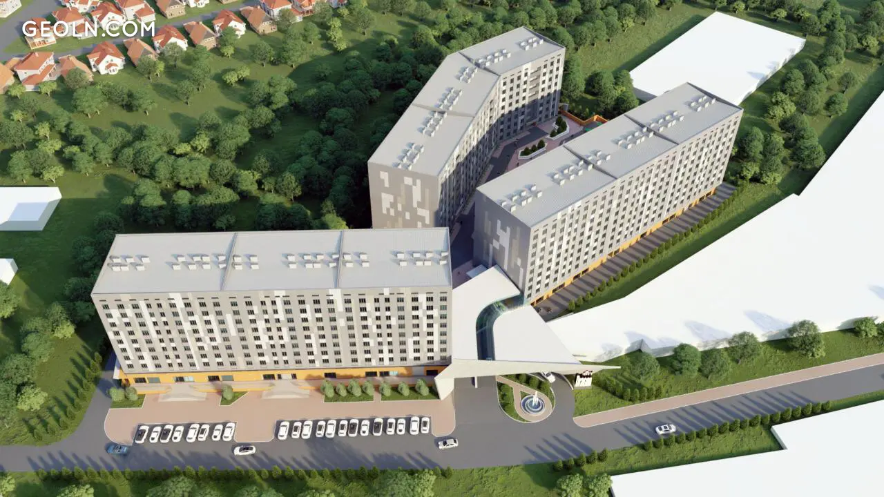 Parking spaces for guest vehicles have been allocated on the territory, an underground parking is also being built with an entrance from the street. The yard is landscaped, ornamental plants are planted, street lighting devices are installed.