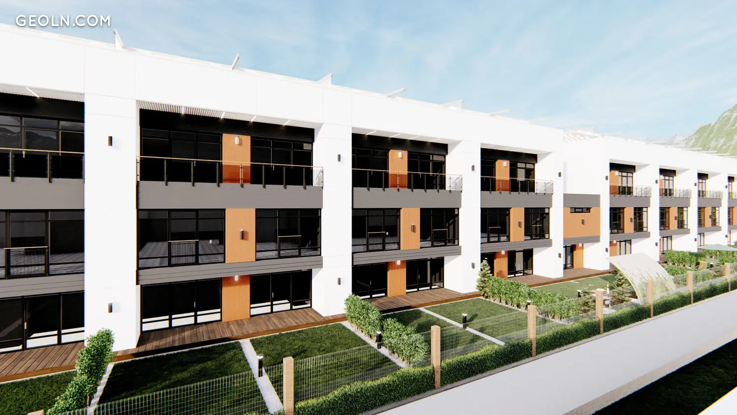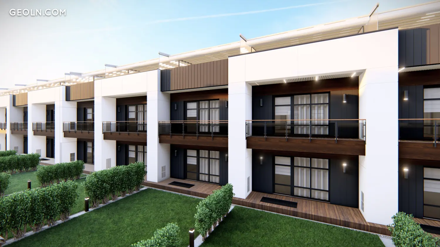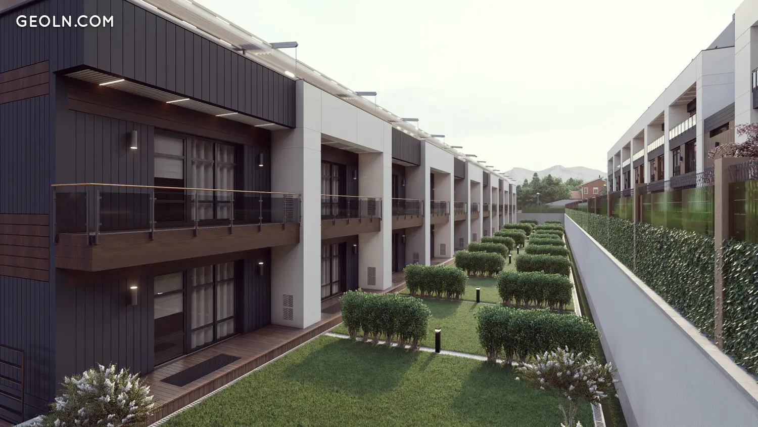 The complex has four blocks, each with seven houses. The buildings are built using advanced technologies from environmentally friendly high quality materials.