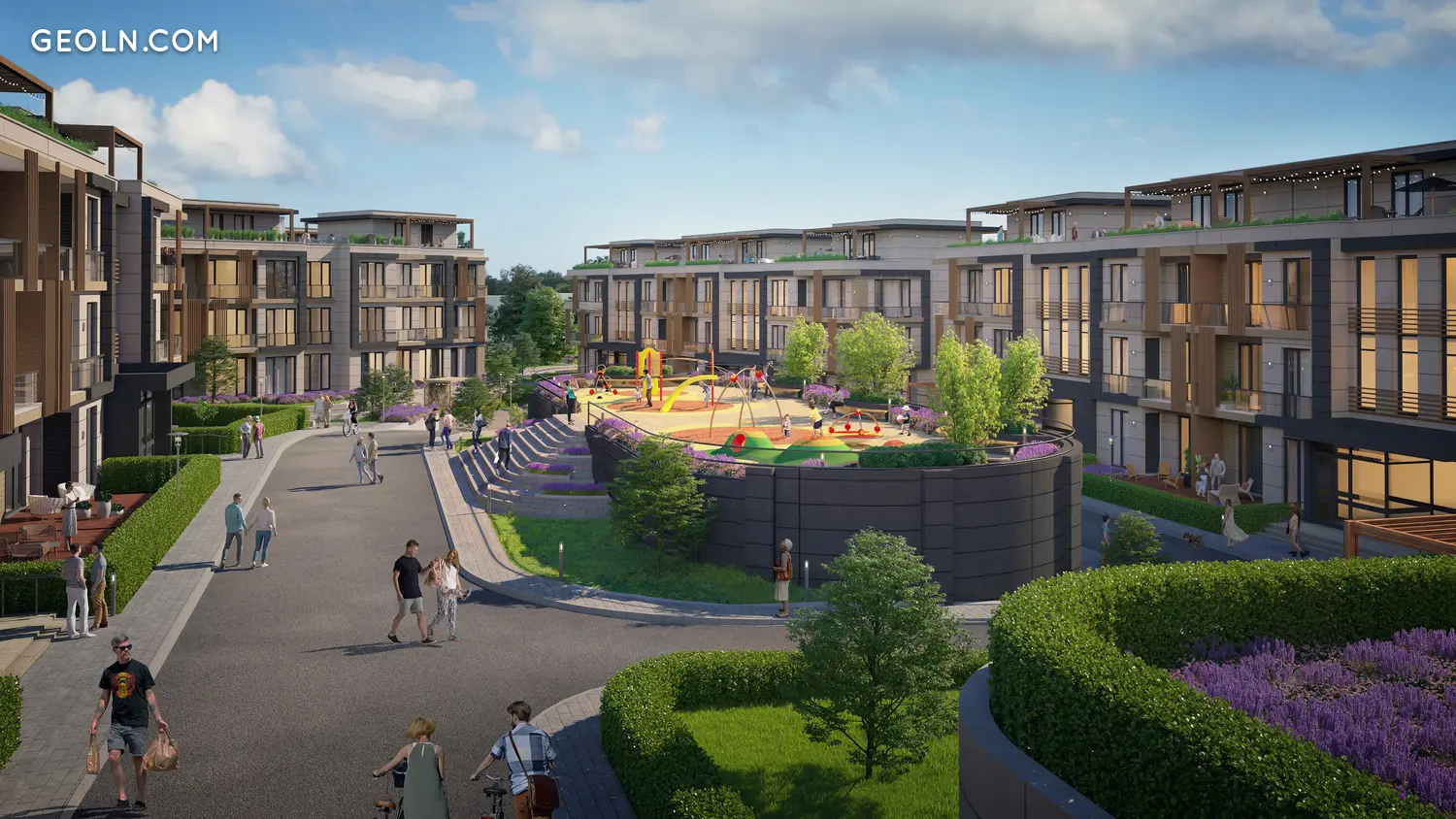 The central square overlooks the fountain, along which there is a quiet walking area with a bike path. A shopping gallery is being built on the territory, private courtyards, playgrounds and sports grounds for children of different ages, as well as recreation areas with gazebos are provided.