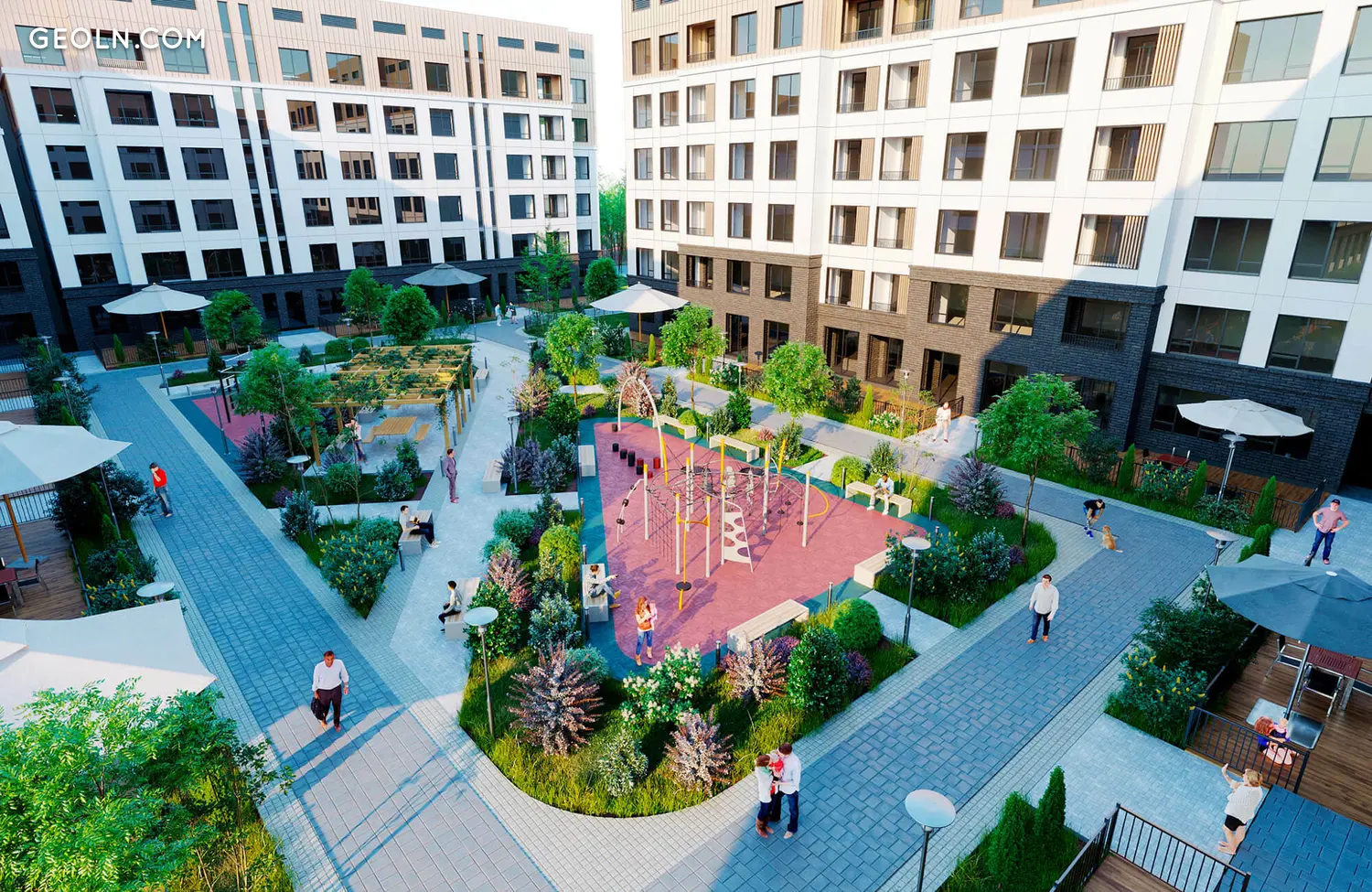 Children's play areas with swings and slides, as well as sports grounds are being built in the courtyards. There are numerous recreation areas with cozy gazebos and benches.