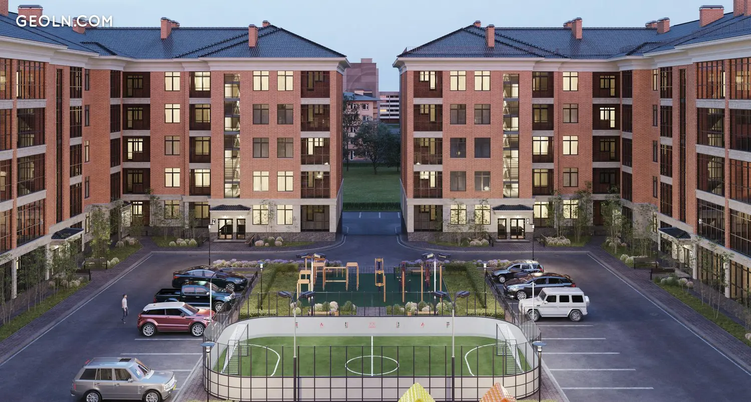 Der Komplex besteht aus zwei fünfstöckigen Gebäuden, die sich organisch in das architektonische Ensemble dieses Stadtteils einfügen. Das Projekt wurde unter Berücksichtigung der Besonderheiten des lokalen Klimas und der seismischen Aktivität im Baugebiet erstellt.