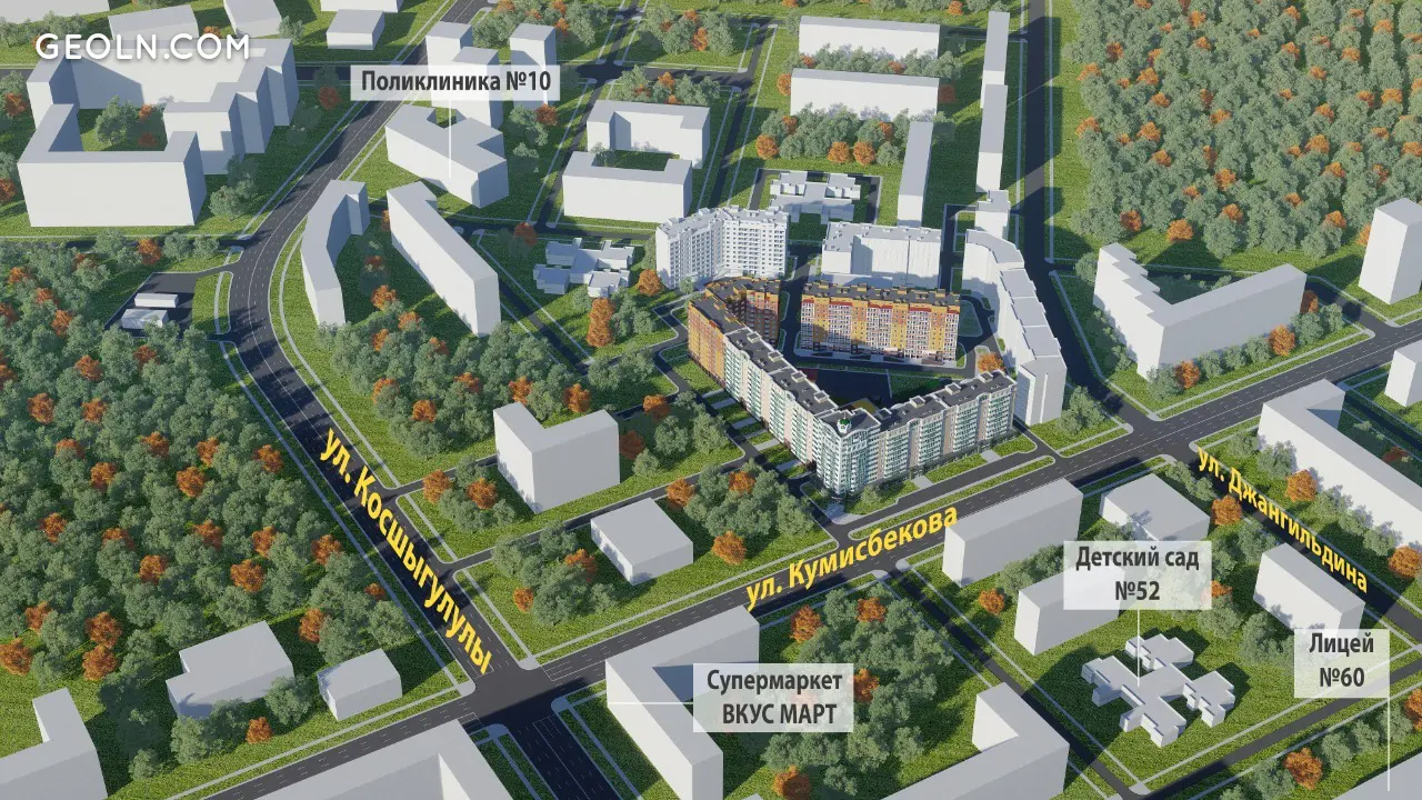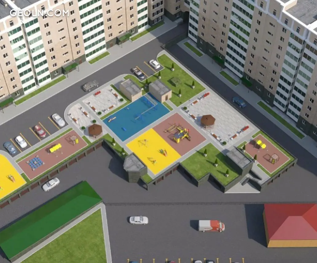The residential complex Tselinograd is located in Nur-Sultan at the intersection of Kumisbekov and Seifullin streets in an area with a full and developed infrastructure, a school and a lyceum are nearby, as well as a kindergarten and a multidisciplinary clinic. Not far from the new building there is Sary-Arka avenue and the Ishim river embankment. To accommodate cars on the territory adjacent to the house, an open-type parking lot is organized.
