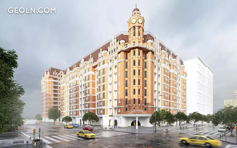 The residential complex "Manchester" consists of three buildings, the construction of which will be carried out in two stages. The first one is planned to build a block with a height of 12 floors, and then two more 9-story sections. Materials such as granite, clinker bricks and marble will be used to decorate the facades. The central focus will be the clock tower.