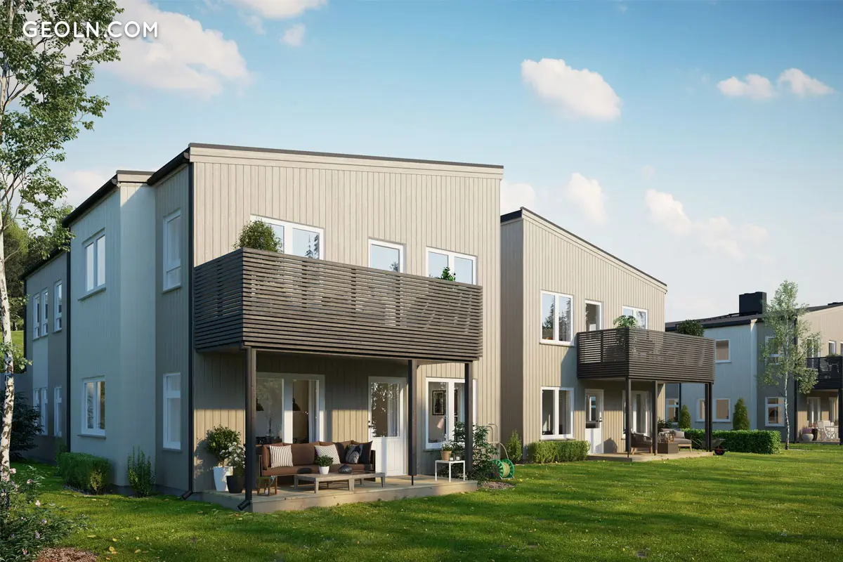 The apartments are airy and spacious with a usable area from 96 to 99 square meters. They are built as four-person homes on two floors with an entrance between the building bodies, which gives a greater distance between the private patios.