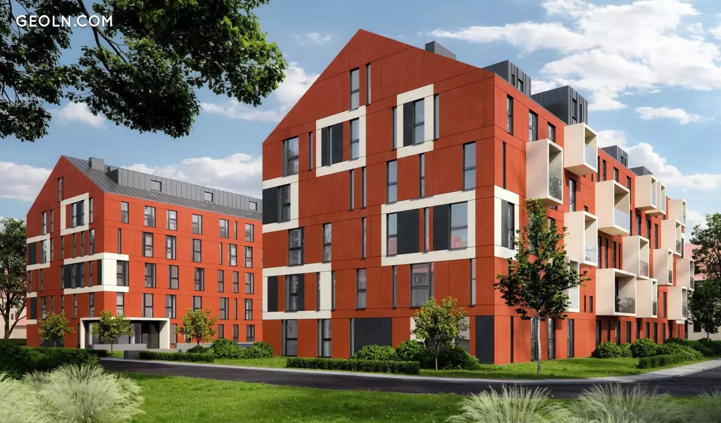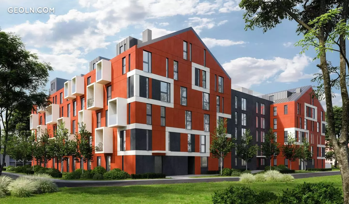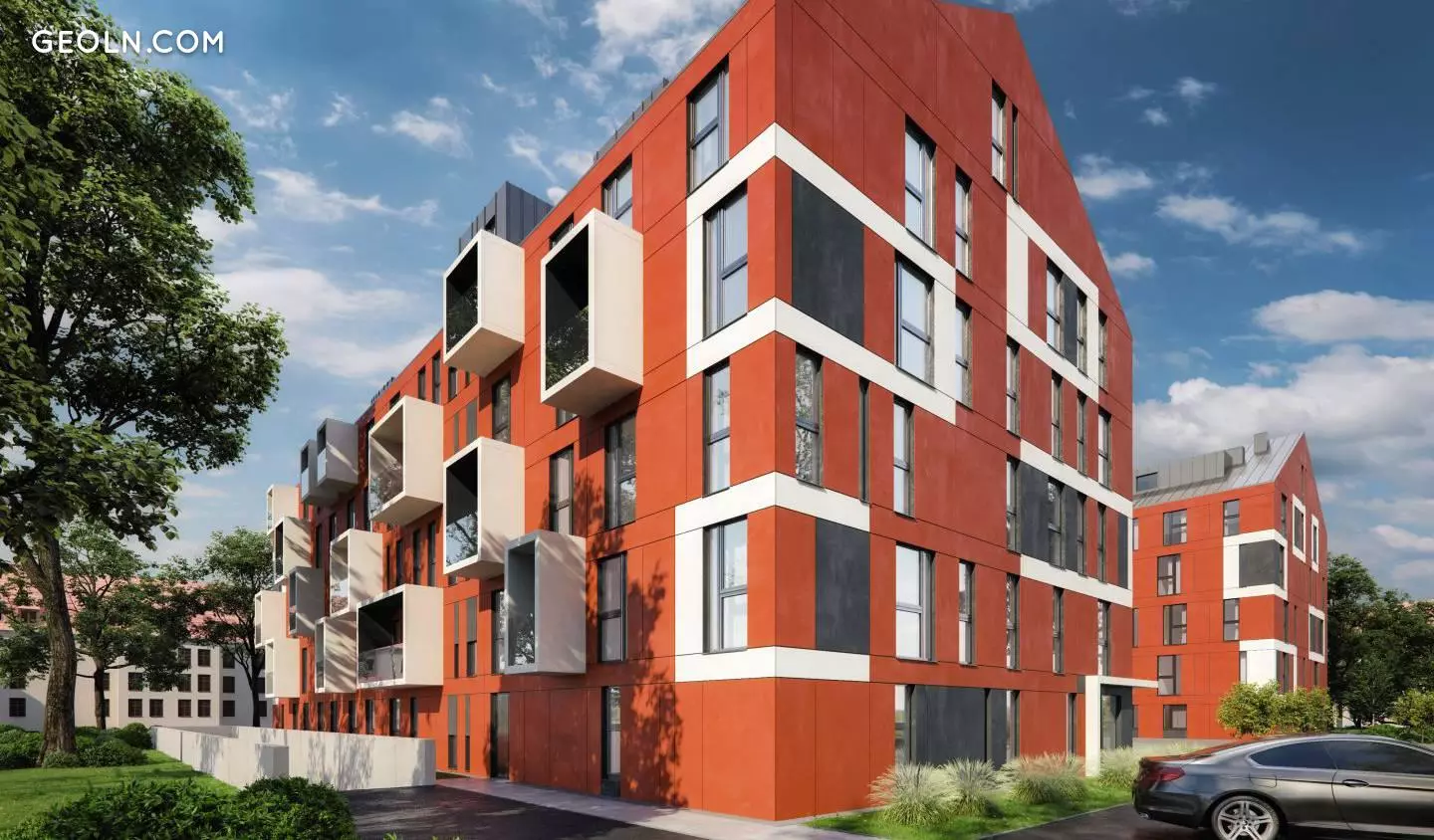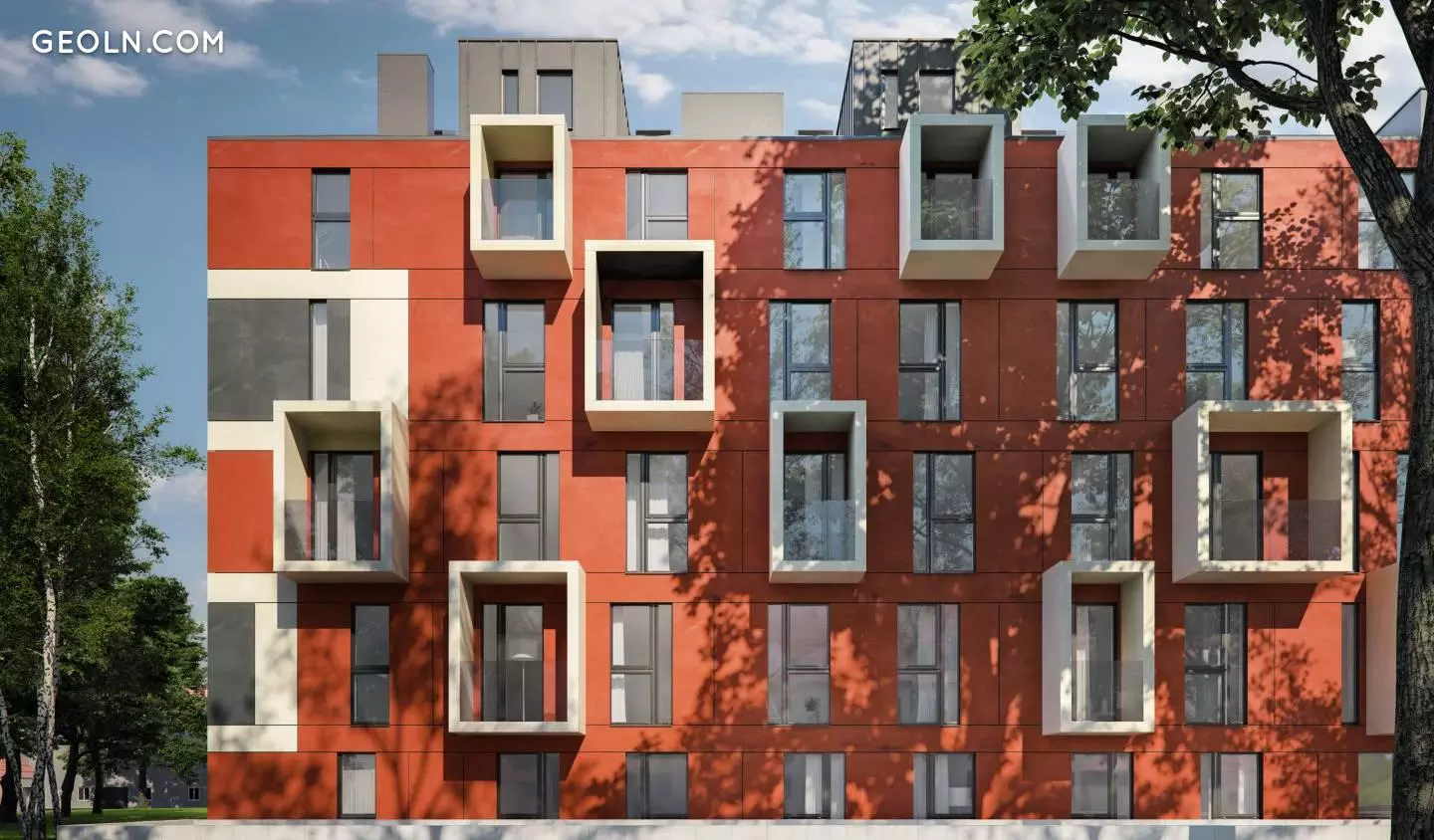 Czteropiętrowy apartamentowiec wykonany jest z prostej bryły w stylu nowoczesnym. W wykończeniach elewacji użyto połączenia kontrastowych odcieni bieli, szarości i czerwieni, dodano elementy dekoracyjne okienne i balkonowe, zaprojektowano dwuspadowy dach.