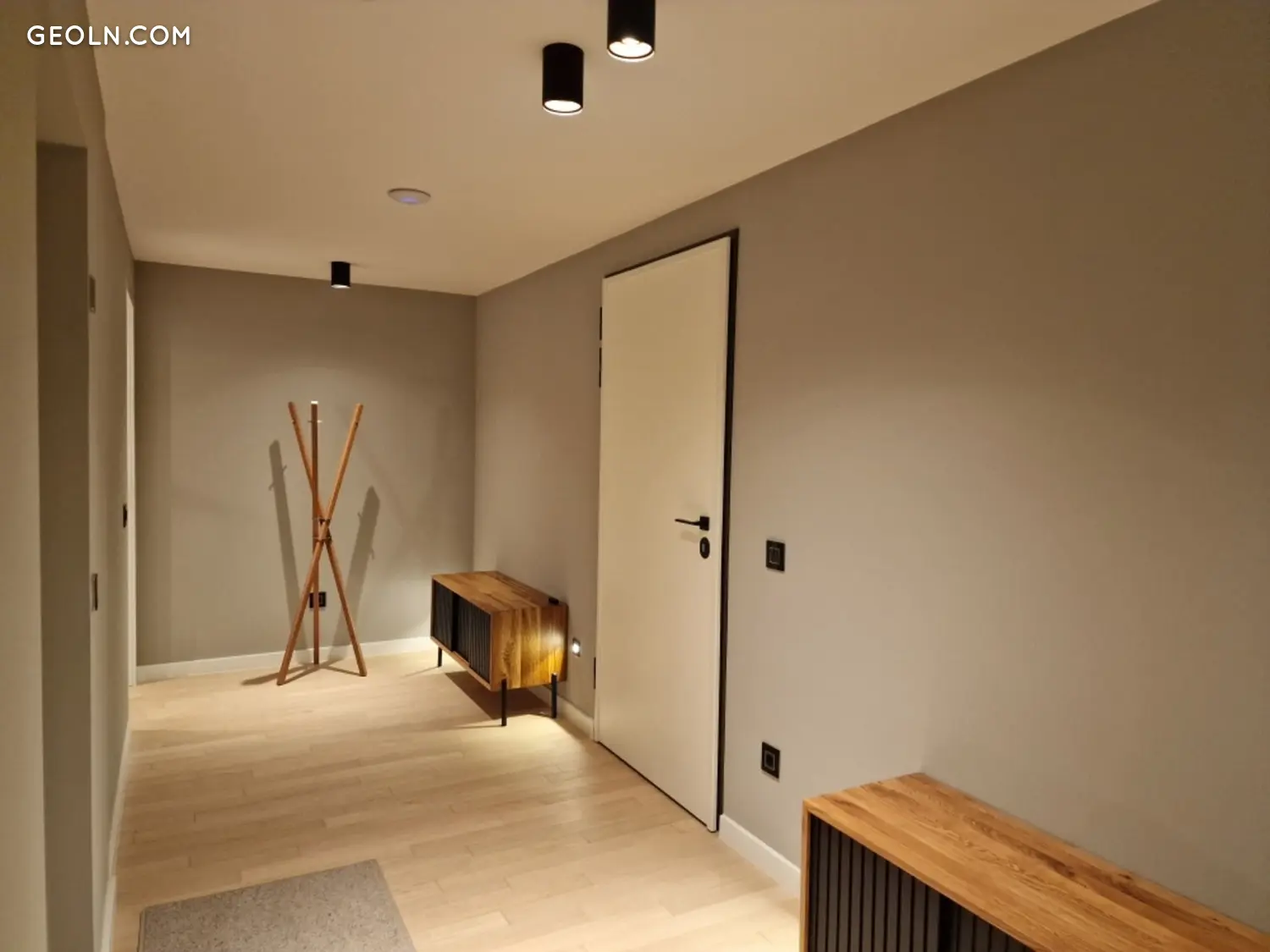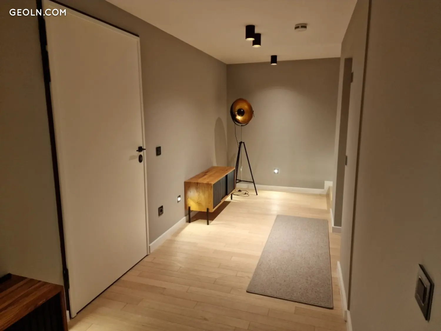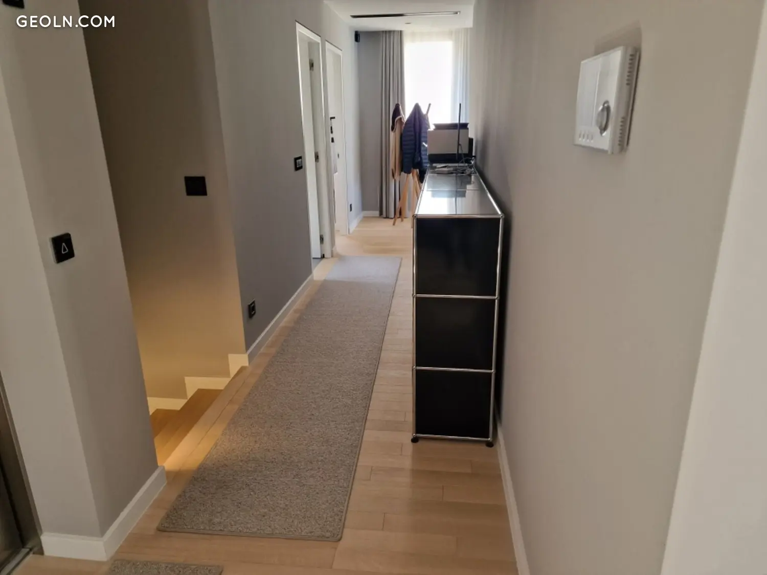 Na parterze znajduje się otwarty salon z kuchnią i jadalnią, łazienka oraz pomieszczenie gospodarcze. Salon ma bezpośrednie wyjście na przestronny taras z basenem infinity poprzez przesuwane szklane ściany. Na piętrze znajdują się trzy komfortowe sypialnie z łazienkami. W piwnicy znajduje się pralnia ze schowkiem oraz garaż na dwa samochody. Przed garażem znajduje się parking na dwa samochody.