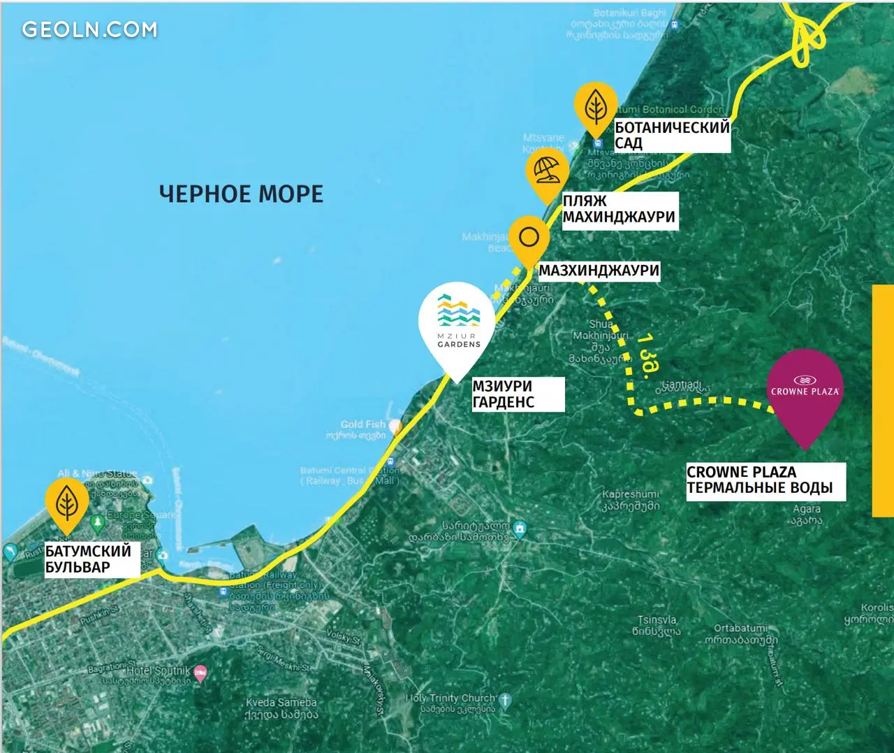 - Расстояния: 6 км до центра Батуми, 20 метров до пляжа собственным мостом и лифтом
