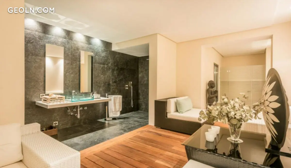 Zewnętrzne wnętrze z przestronnym basenem, oryginalnymi elementami wodnymi i subtropikalnymi ogrodami krajobrazowymi jest zaprojektowane w tym samym stylu co dom i wywołuje poczucie harmonii i piękna.