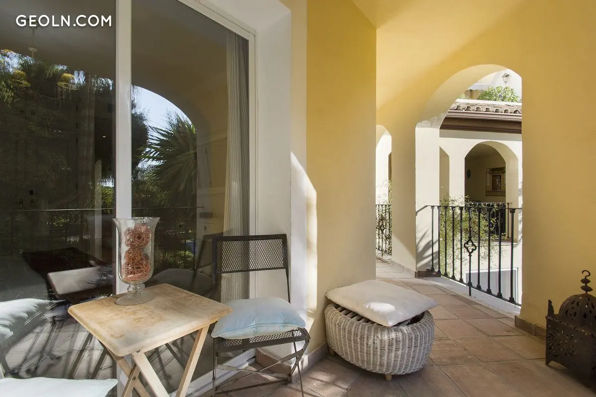 Posiadłość od strony południowo-wschodniej posiada prywatny taras o powierzchni 15m2 z widokiem na dojrzałe ogrody i basen komunalny.
