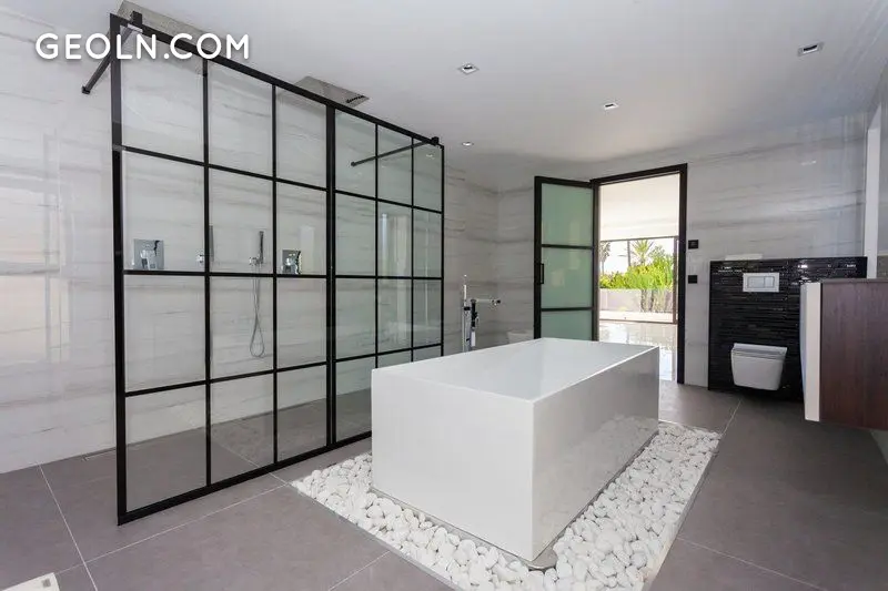 Duży podgrzewany (15 x 5) basen z wodospadem i jacuzzi w ogrodzie jest idealnym miejscem na relaks, rozrywkę i cieszenie się dużymi odkrytymi tarasami. Na taras na dachu można dostać się zewnętrznymi schodami, z których roztacza się widok na morze i góry.
