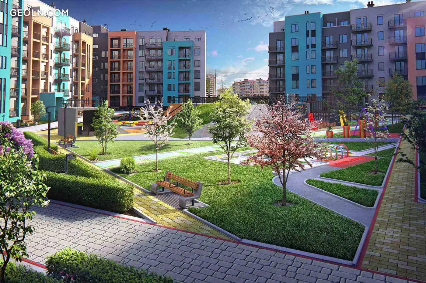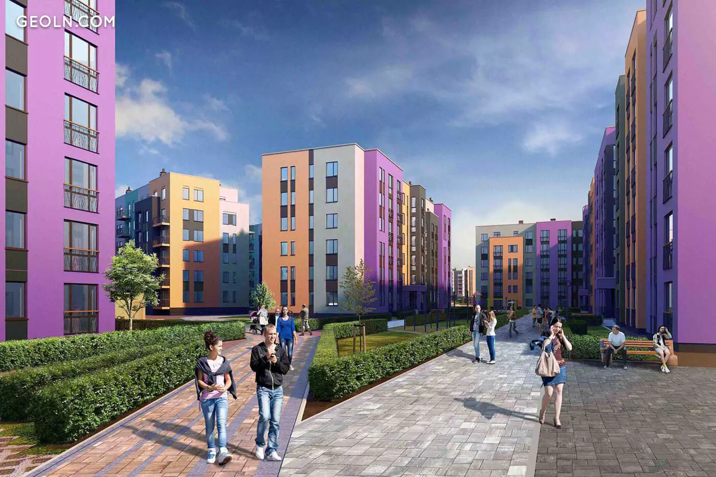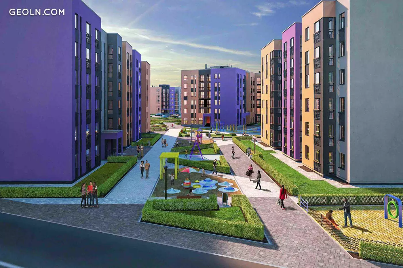 Территория комплекса - охраняемая, благоустраивается, устраиваются проезды для спецтранспорта, организуются зоны отдыха и прогулочные дорожки, обособленные от проезжей части. Инфраструктура новостройки предусматривает создание школы, детского сада и медицинского центра.