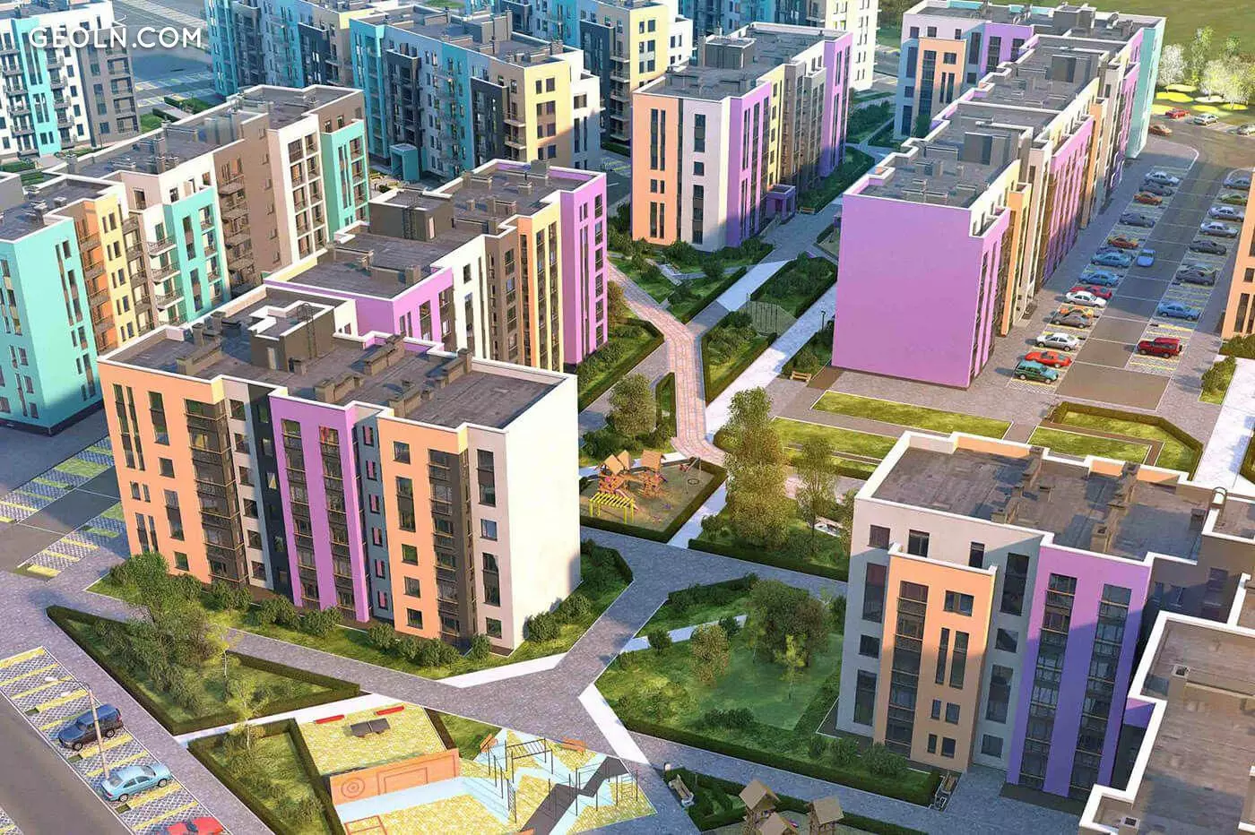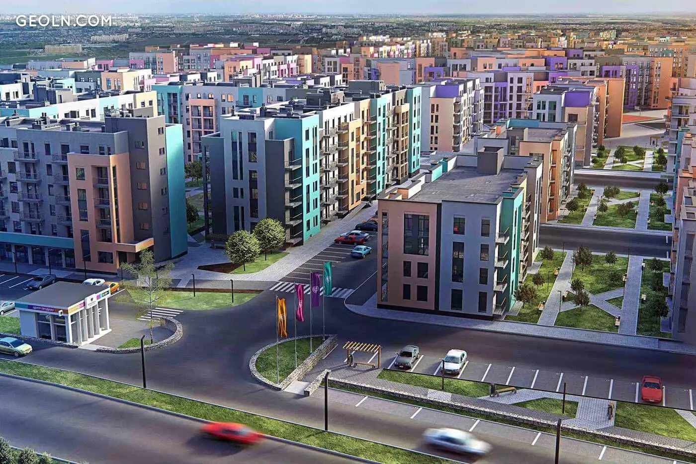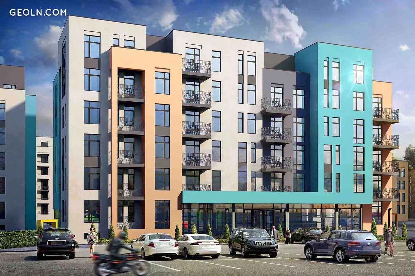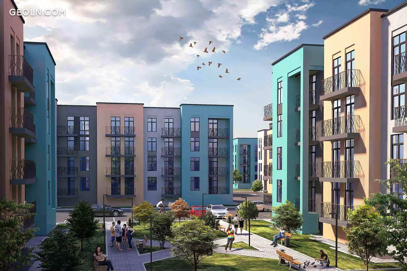 Территория комплекса - охраняемая, благоустраивается, устраиваются проезды для спецтранспорта, организуются зоны отдыха и прогулочные дорожки, обособленные от проезжей части. Инфраструктура новостройки предусматривает создание школы, детского сада и медицинского центра.