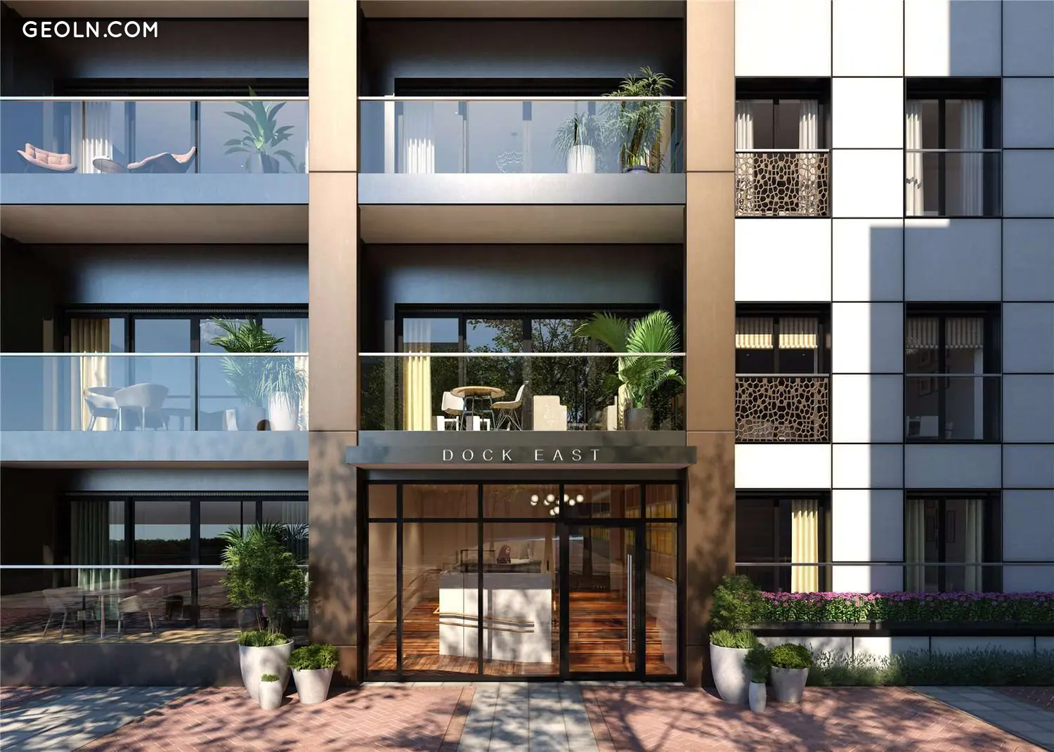 Dock East znajduje się na Wyspie Psów, historycznej części londyńskiej dzielnicy Tower Hamlets. Otoczony Tamizą półwysep jest także domem dla Canary Wharf, dynamicznej dzielnicy finansowej, która oferuje wiele światowej klasy sklepów, a także szereg drapaczy chmur, biurowców i tętniących życiem klubów nocnych. Z widokiem na Millwall Dock, Dock East znajduje się zaledwie rzut kamieniem od Mudchute Park, rozległego zielonego obszaru rozciągniętego na 32 akrów wsi, na którym znajduje się farma, sesje spotkań ze zwierzętami, stajnie, żłobek dla dzieci i szeroka gama zajęć edukacyjnych . Tymczasem w sąsiednim Millwall Park znajduje się wiele obiektów sportowych, w tym boiska do piłki nożnej i krykieta. Oprócz malowniczych nadrzecznych promenad, okolica oferuje plażę Folly House, na której można cieszyć się wodami Tamizy.