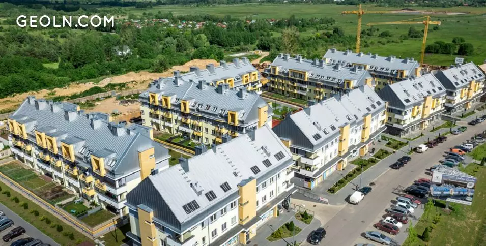 The buildings of the Cisów Valley estate have a modernist character, simple form, and bright white and gray colors. Large glazing is part of the architectural layout of the facade.