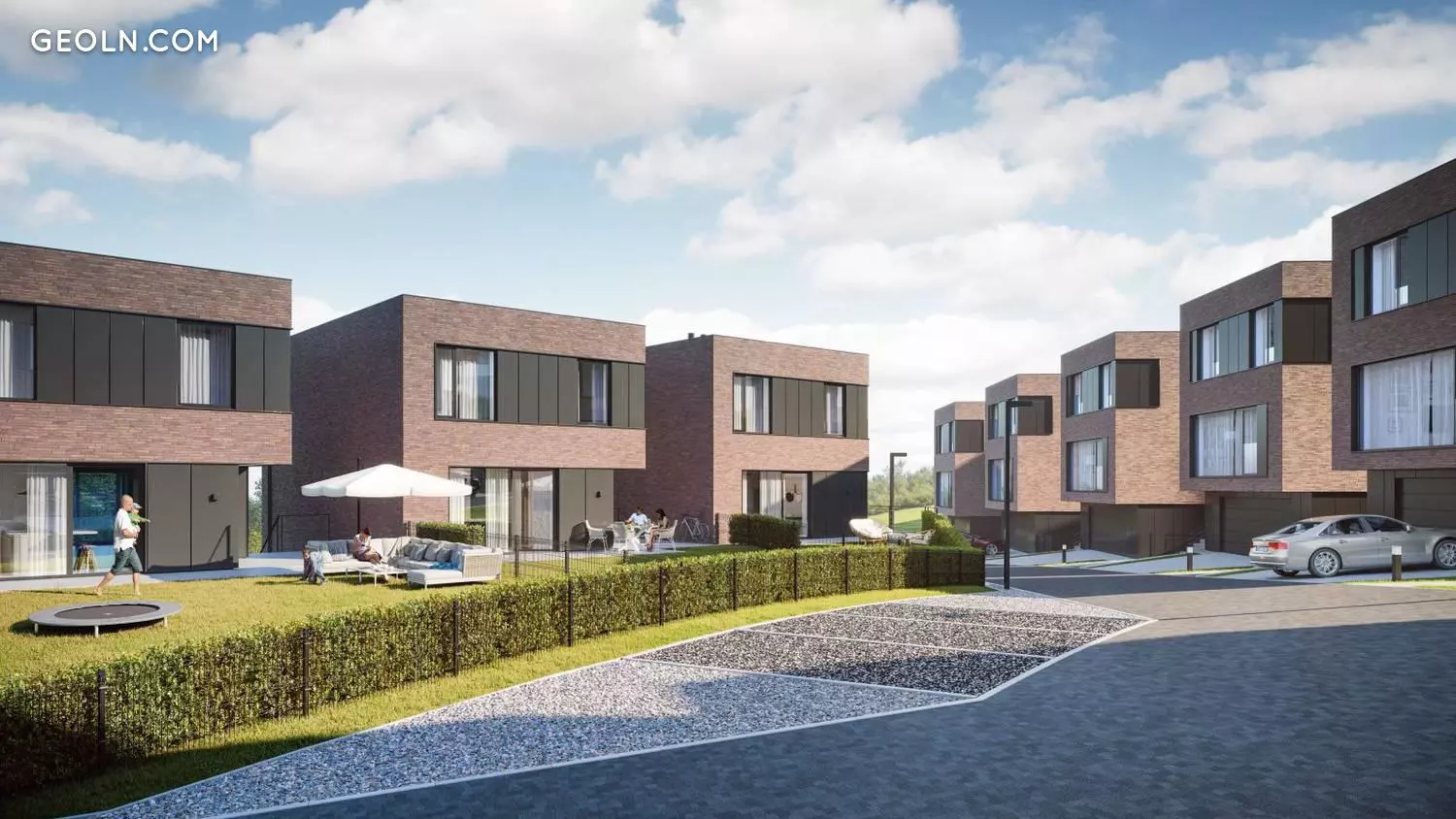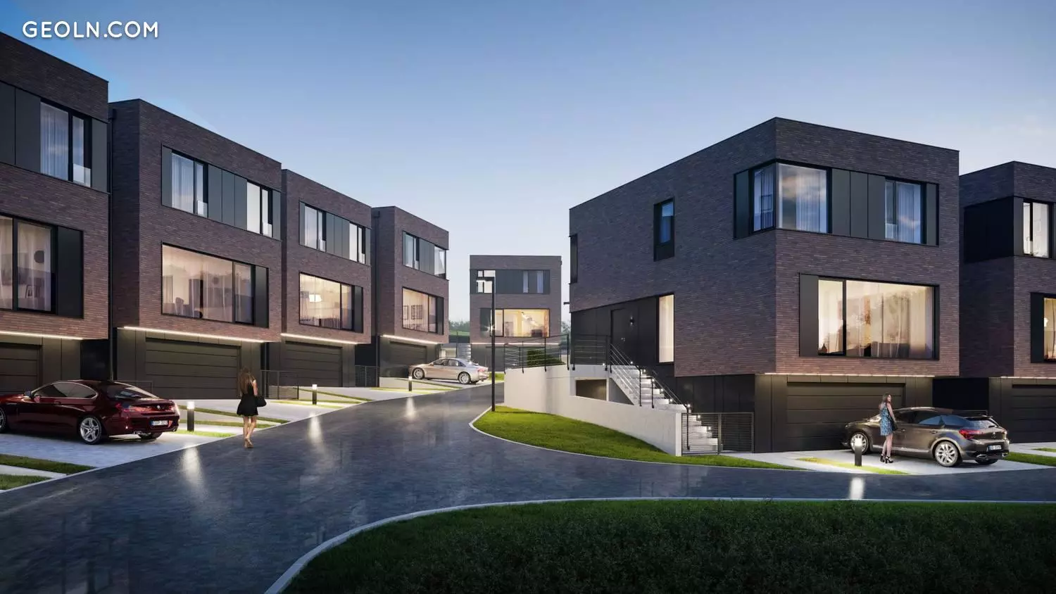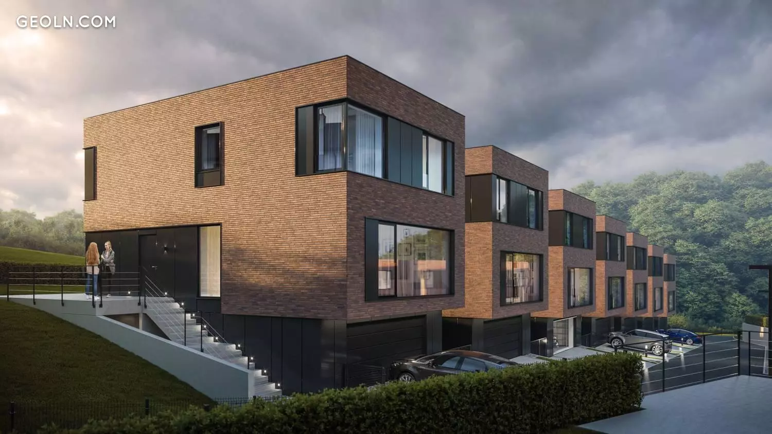 The three-storey houses are kept in a modern industrial style, a simple body was used, flat roofs were made, clinker and cement facades in a color combination of dark brick and gray shades, and extensive glazing.