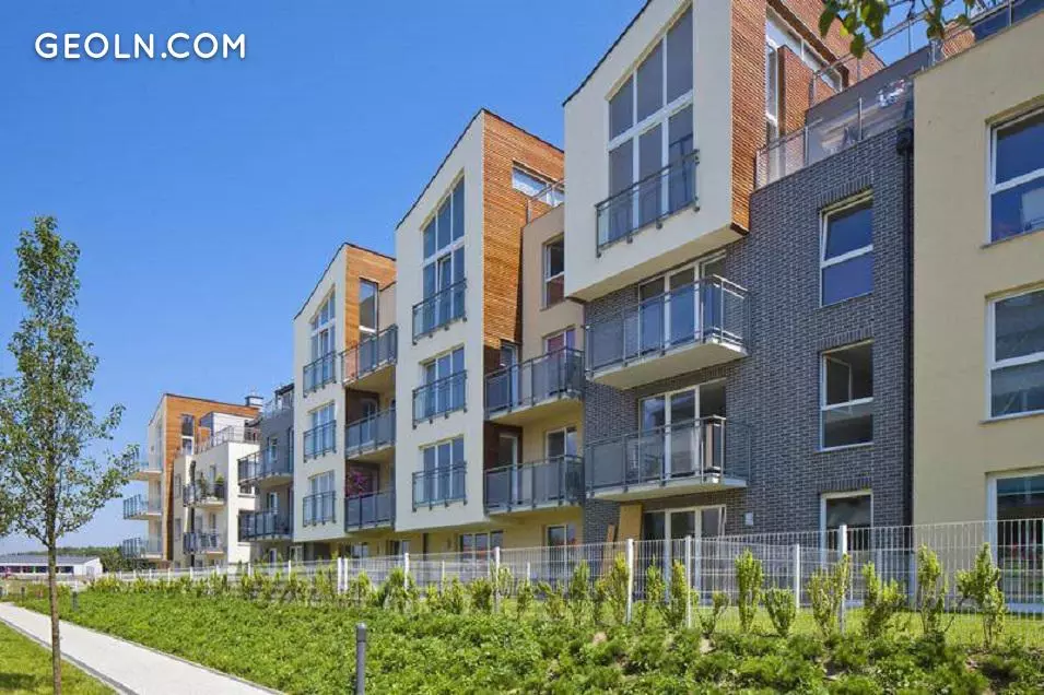 The four-storey buildings are designed in a modern style. In the architectural layouts, a straight and an oblique solid were combined, various geometric shapes were used. The facade is finished with plasters, clinker bricks, panels and numerous wooden elements; They are dominated by subdued colors and shades of beige and light gray. Panoramic windows and glazed steel balcony and terrace balustrades were made.
