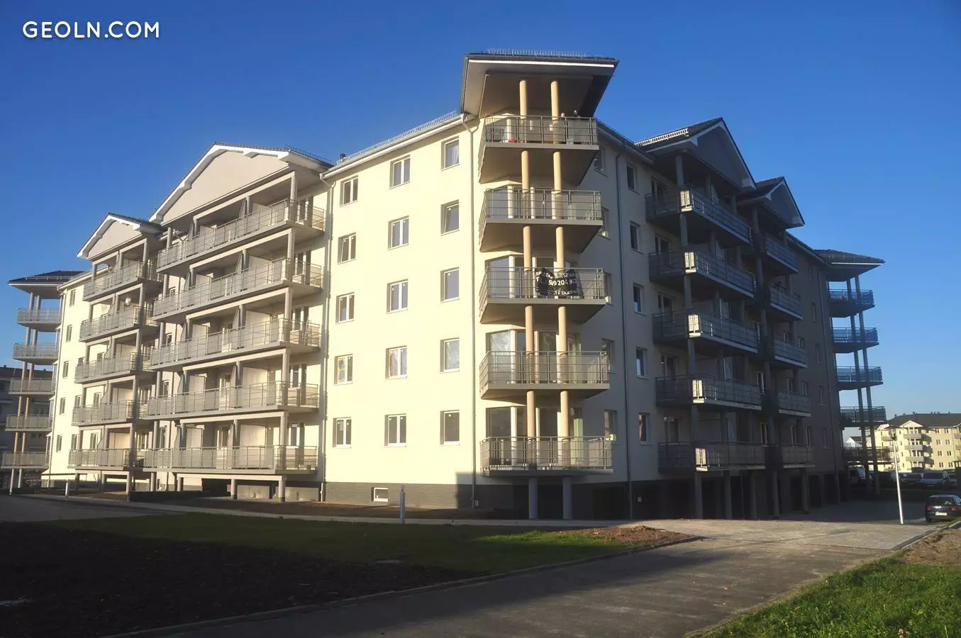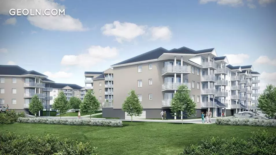 The investment includes six four-story multi-family buildings. The facades are made in light colors, and the architectural layout uses a simple block. There are sloping attics in the upper storey.