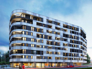 The six-story buildings of the Dąbska Street estate are designed in a modern style. A simple shape was used in the architectural layouts. The façade was made in subdued colors with the predominance of shades of light beige, gray, elements imitating wood. Panoramic windows and glazed steel balcony and terrace balustrades were made.