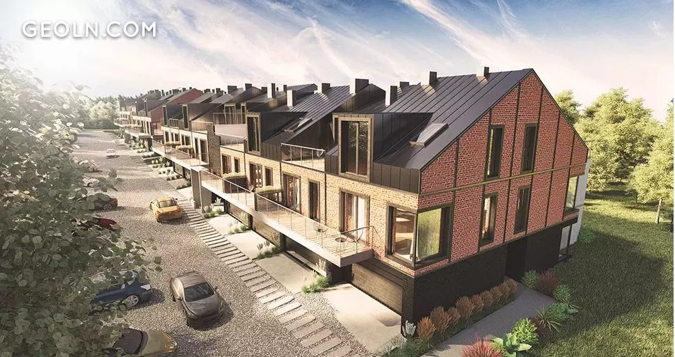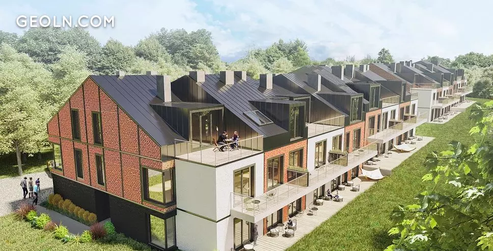 The estate is made up of two-story buildings with a traditional design under sloping graphite-colored roofs. The side walls and fragments of the front walls are made of red brick, referring to the traditional architecture of industrial Łódź. The facades are decorated with large glazing.