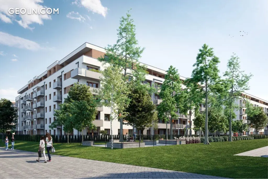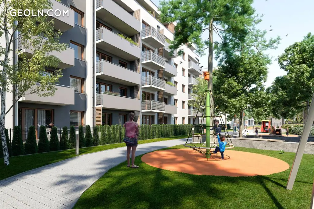 In the vicinity of the estate there is a park. Szarych Szeregów, sports clubs, stadium, recreation centers, church, post office, medical centers, primary school no. Heroic Children of Łódź and kindergarten No. 77 (800 meters), private primary school Kornelówka, kindergarten No. 9, nursery No. 12 and Secondary School No. XXIV (within 1.1 kilometer). Nearby retail outlets include the Lewiatan grocery store (650 meters), E.Leclerc hypermarket (800 meters), Żabka, Carrefour Express and Stokrotka stores (950 meters). The Łagiewniki Forest can be reached in nearly 10 minutes by car.