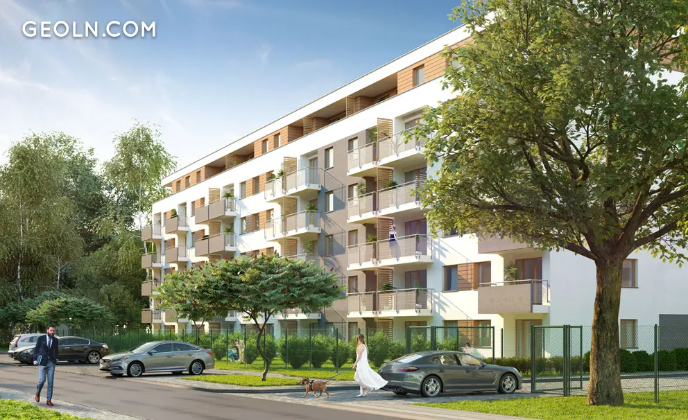 The five- and six-storey buildings of the investment were built in a simple modern style. Bright shades prevail in the façade finishes, wooden-colored decorative elements, steel and concrete balcony railings and numerous glazing have also been added. In part of the investment, a retail and service space was designed on the ground floor.
