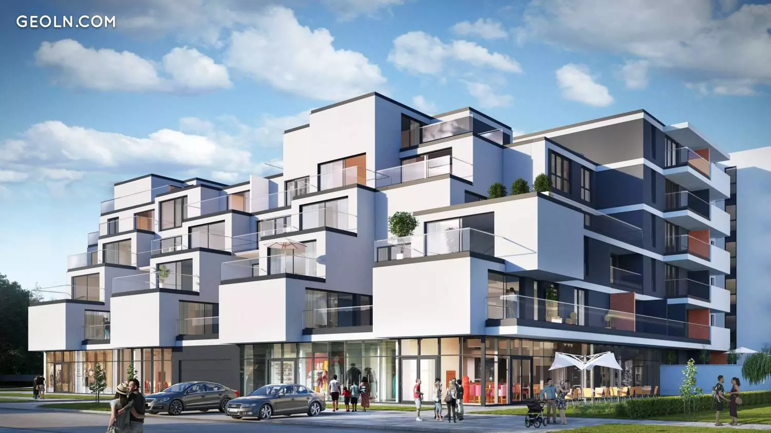 The investment was designed by the MKC studio and is being implemented in two stages. The body of the building with a modern and elegant design, cascading layout, bright colors. The building has six above-ground storeys, large panoramic windows and spacious terraces, service premises on the ground floor.