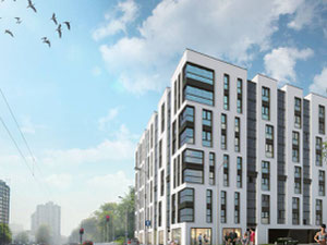 The 7-storey apartment building is built in a modernist L-shape. Various solid layouts, ergonomic geometric shapes, light shades in the facade finishes, large glazing were used. On the ground floor there is space for commercial and service premises. The common parts of the investment are finished in the art deco style.