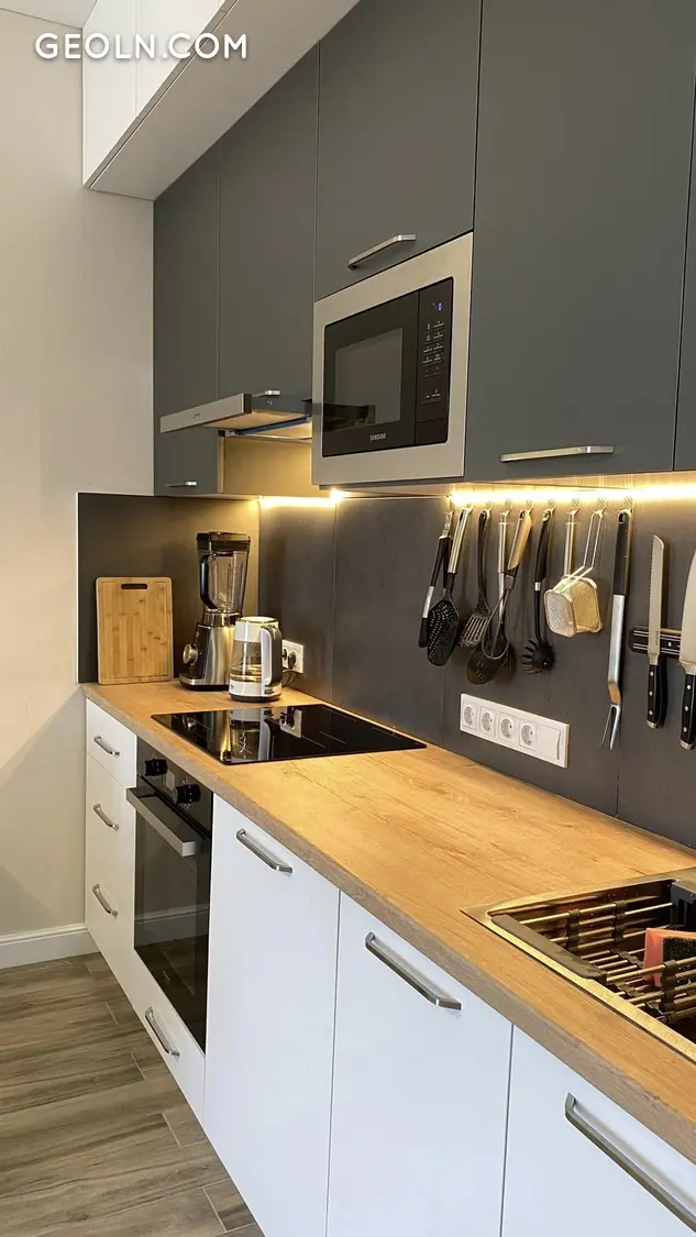 Kitchen is a hostess' dream that came true. There is not only a full-fledged Indesit dishwasher 60 cm wide, but also an Ariston convection oven, an Ariston induction cooker with an Ariston timer, an Indesit hood, a Samsung microwave, a Bort waste shredder and an Aquaphor reverse osmosis filter. The ergonomics are well thought out, there are enough sockets and hooks, a magnet for knives, illumination of the work surface, doors of all drawers with closers, Grohe faucet. The Beko refrigerator is the most spacious and quiet of the brothers. It has a shelf for bottles, and in the vegetable section there is a special day/night lighting for better storage.