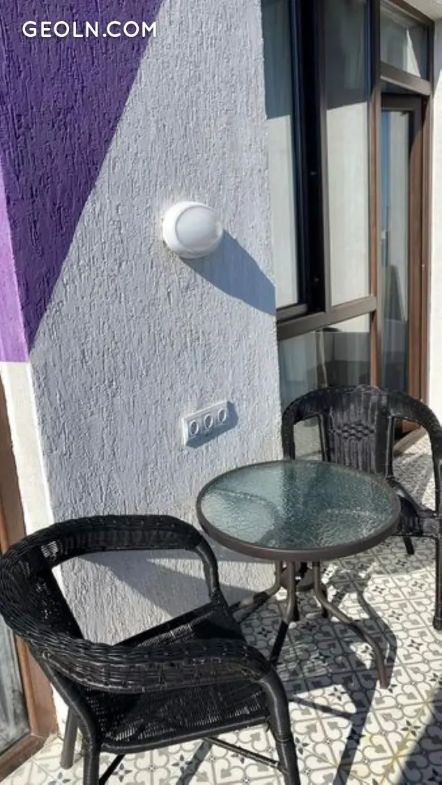 On the balcony there is a brazier and wicker chairs with a table and lighting.