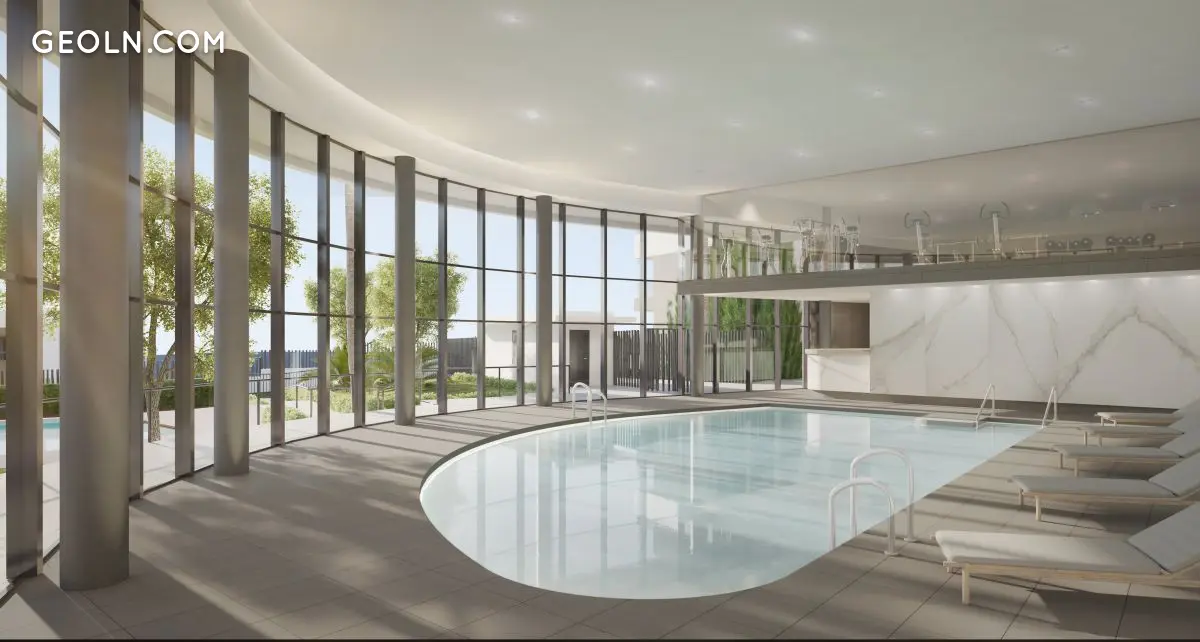 Each living space has common areas that include gardens and a communal pool. There is an indoor pool and a fully equipped gym. In addition, parking spaces and storage rooms for each apartment are located in the basement of the complex.
