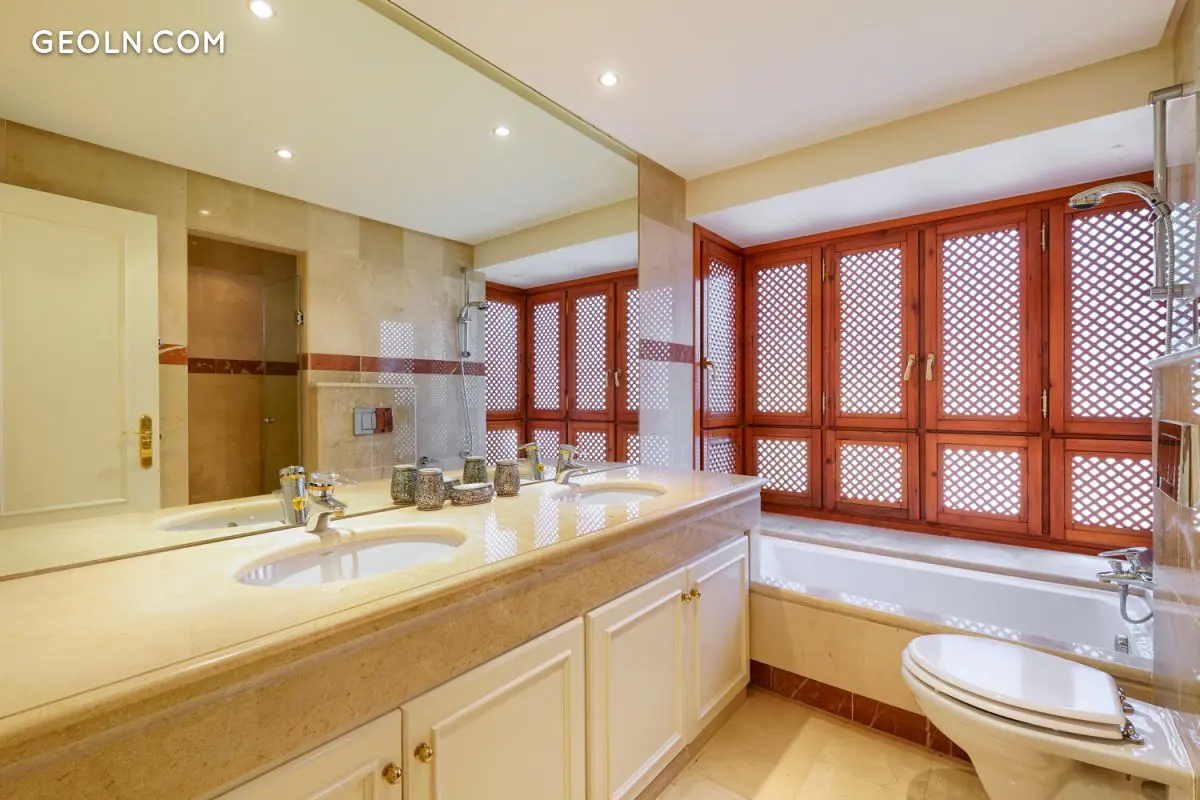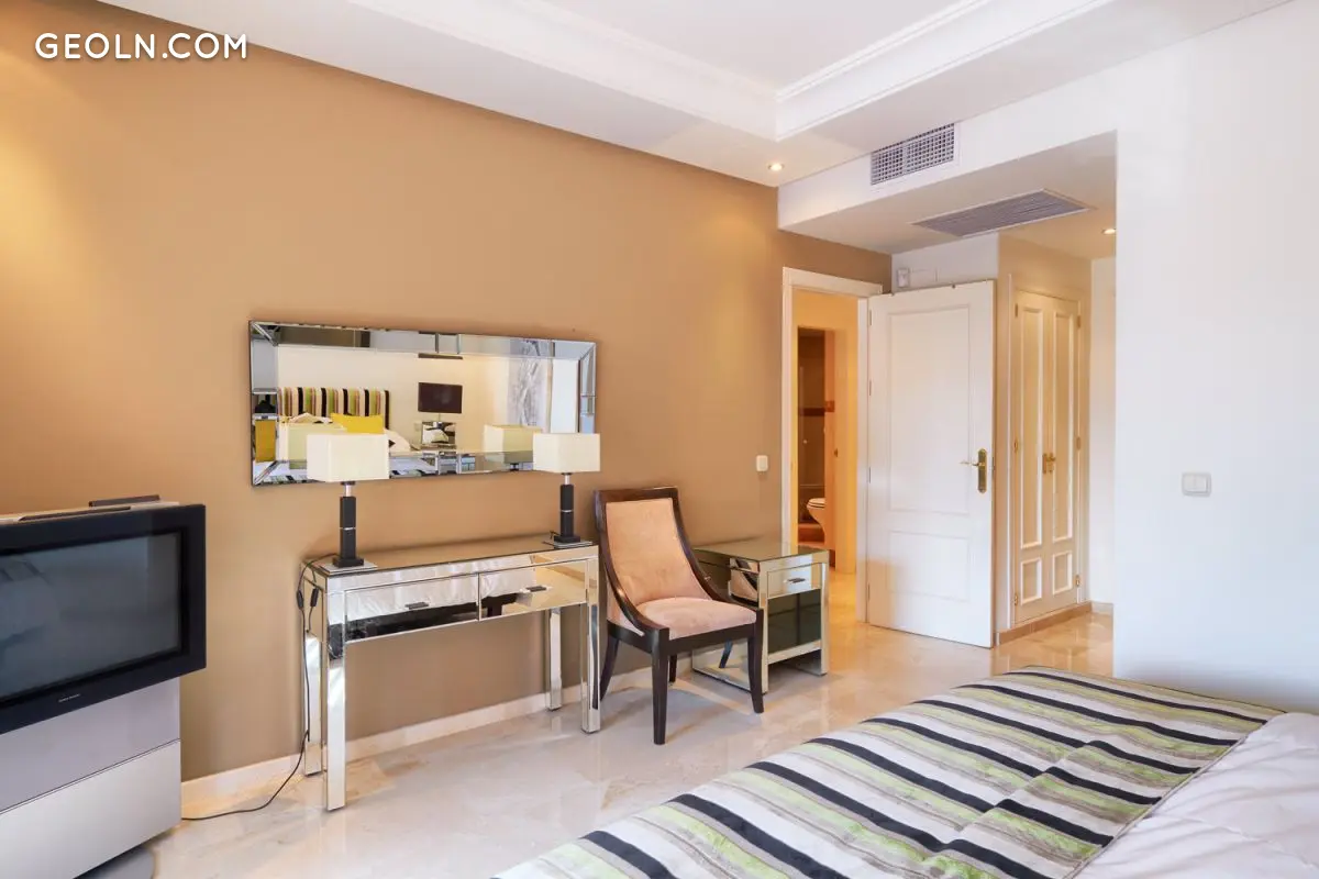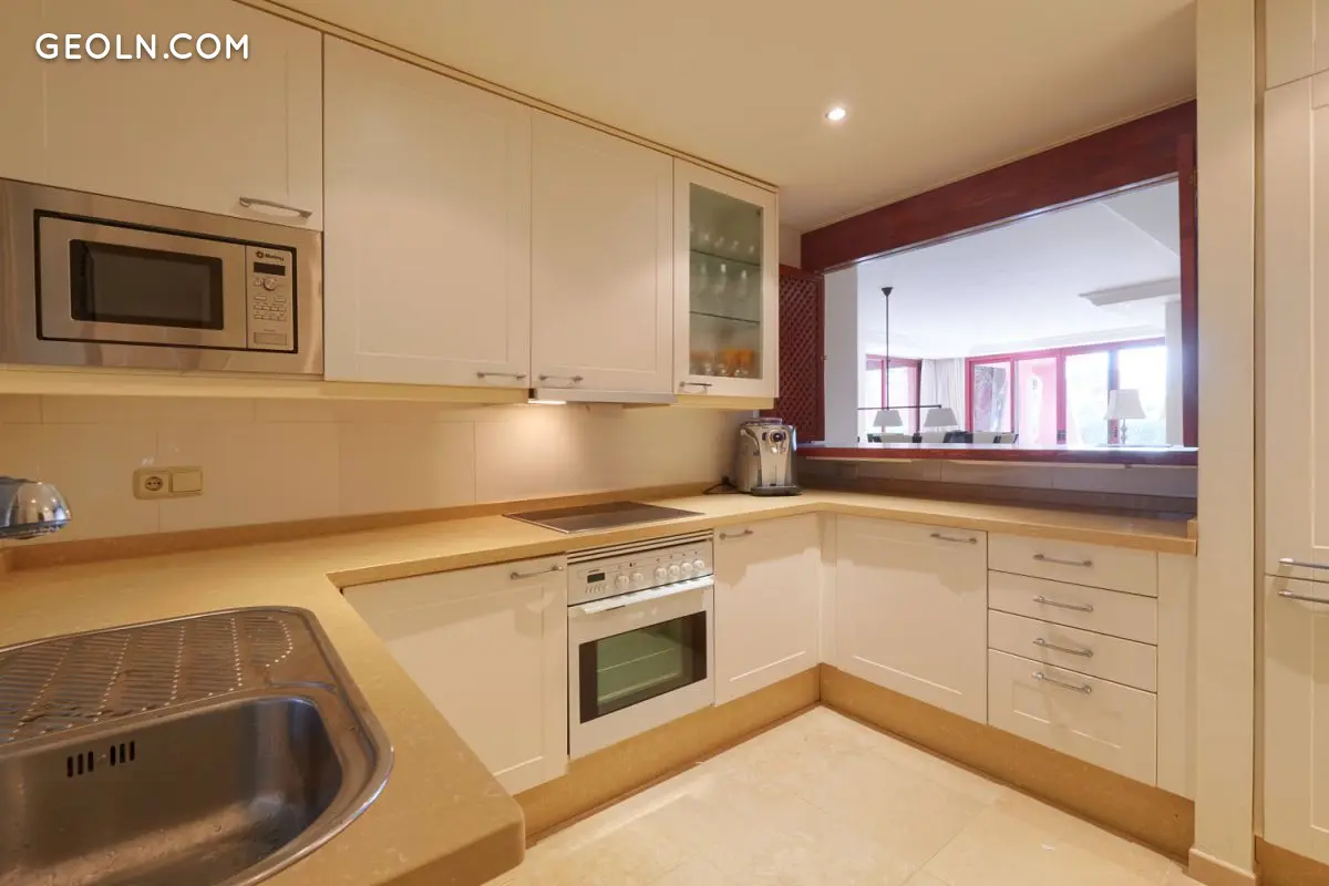 Spacious, luxurious apartment on the first floor in an excellent complex on the first line of the sea. South facing, just a few minutes walk from the beach.Large living and dining area, fully equipped kitchen and laundry room. Master bedroom ensuite, one guest bedroom ensuite and another bedroom ensuite.