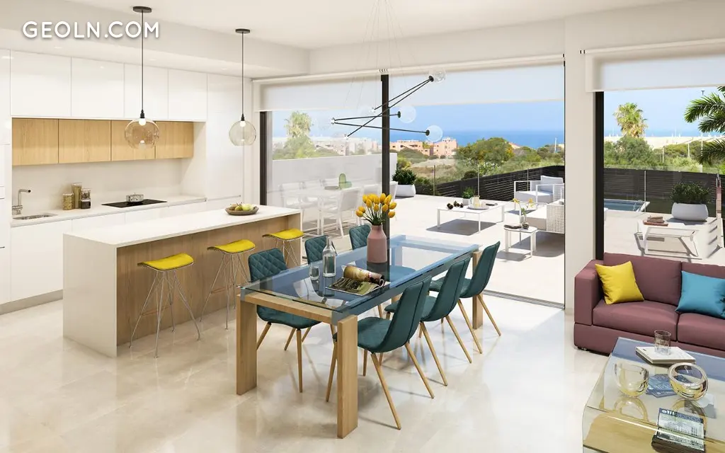 Royal Park Sea is a new concept duplex apartment located in Guardamar, just 600 meters from the beach. The houses are divided into two floors, with 3 bedrooms and 2 or 3 bathrooms, depending from the model. The lower apartments have terraces starting at 45 meters and the apartments on the top floor have private solariums overlooking the sea. All houses have a parking space, and in the case of some ground floor models, the garage is private. In addition, the residential complex has a beautiful communal area with a garden and a swimming pool. 13; Are you looking for a home in Guardamar? Come see the Royal Park sea!