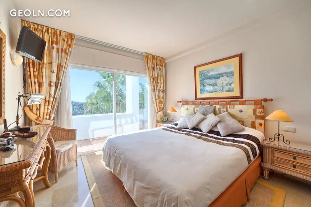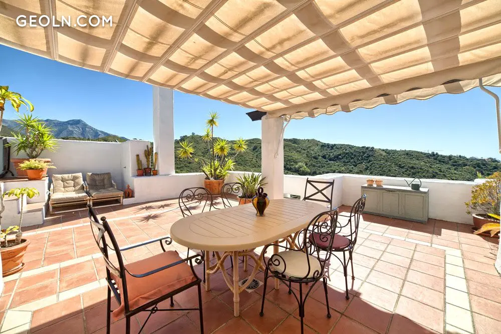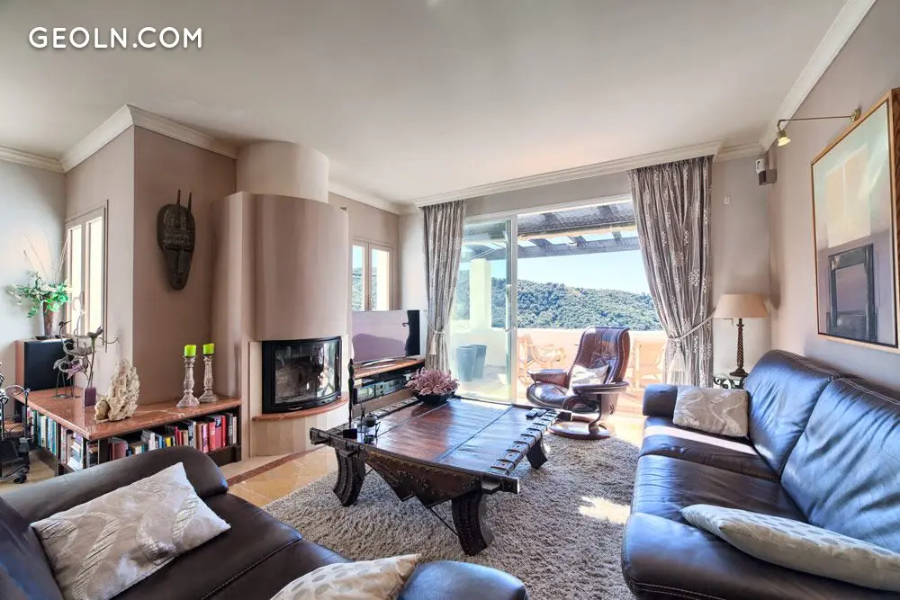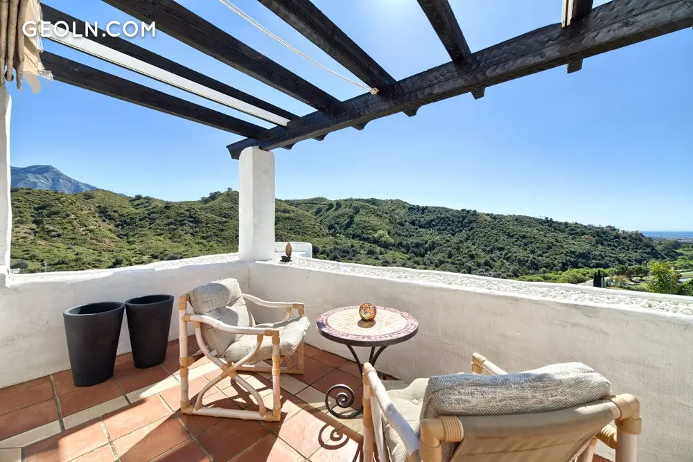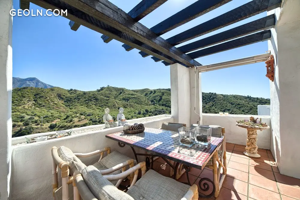 Beautiful, spacious and bright corner penthouse. South facing, with great views of the sea, mountains and golf. Quiet and private complex.Main floor: large living room with fireplace and fully equipped kitchen. Direct access to several spacious terraces with magnificent views. Two guest rooms. Upstairs: bedroom, large terrace with barbecue area and jacuzzi.