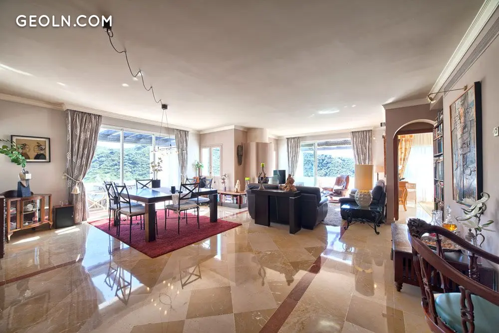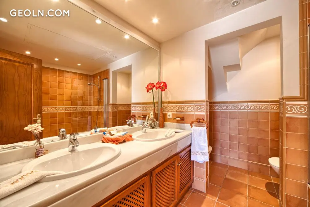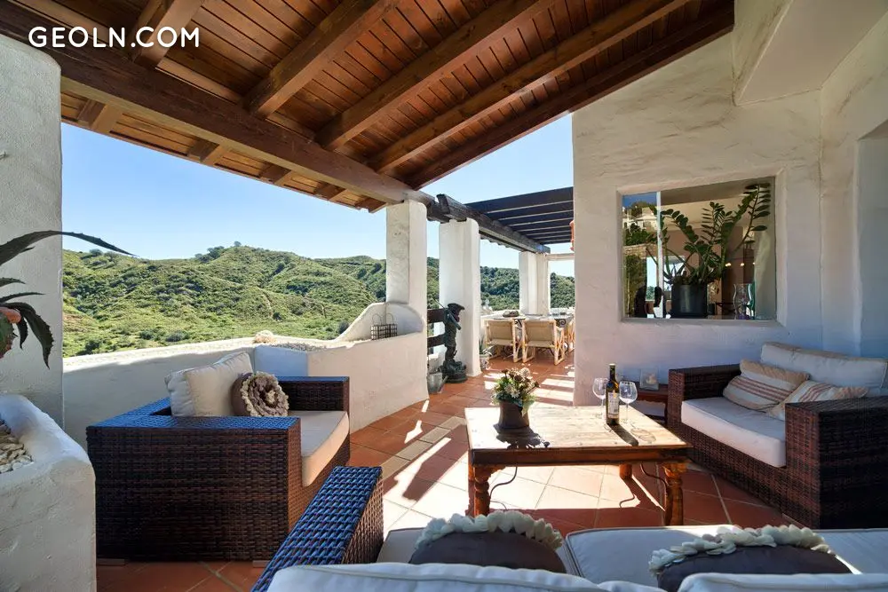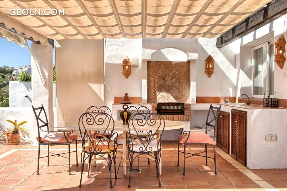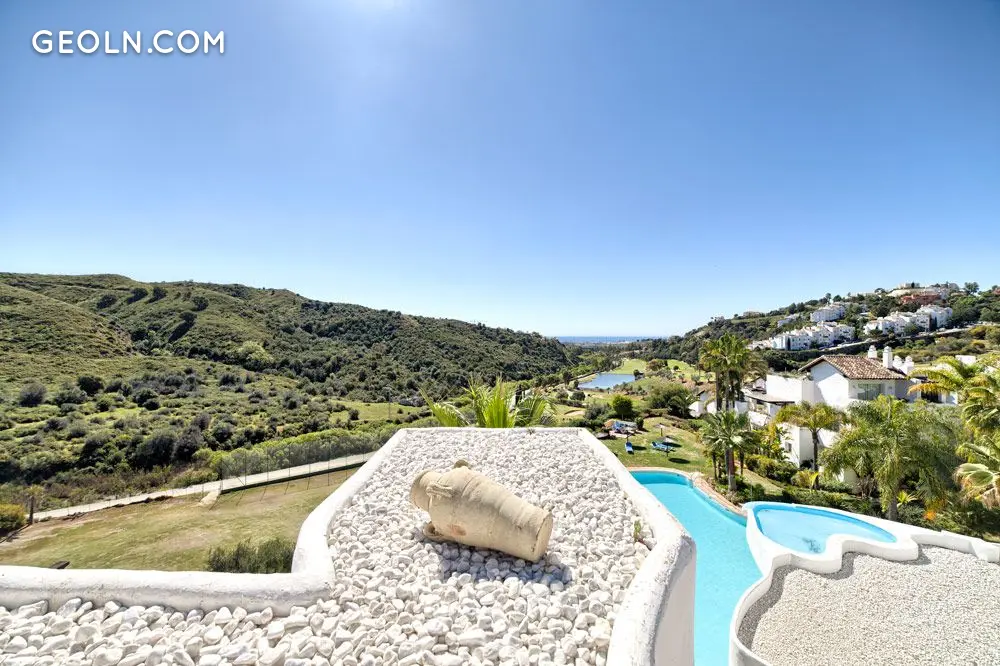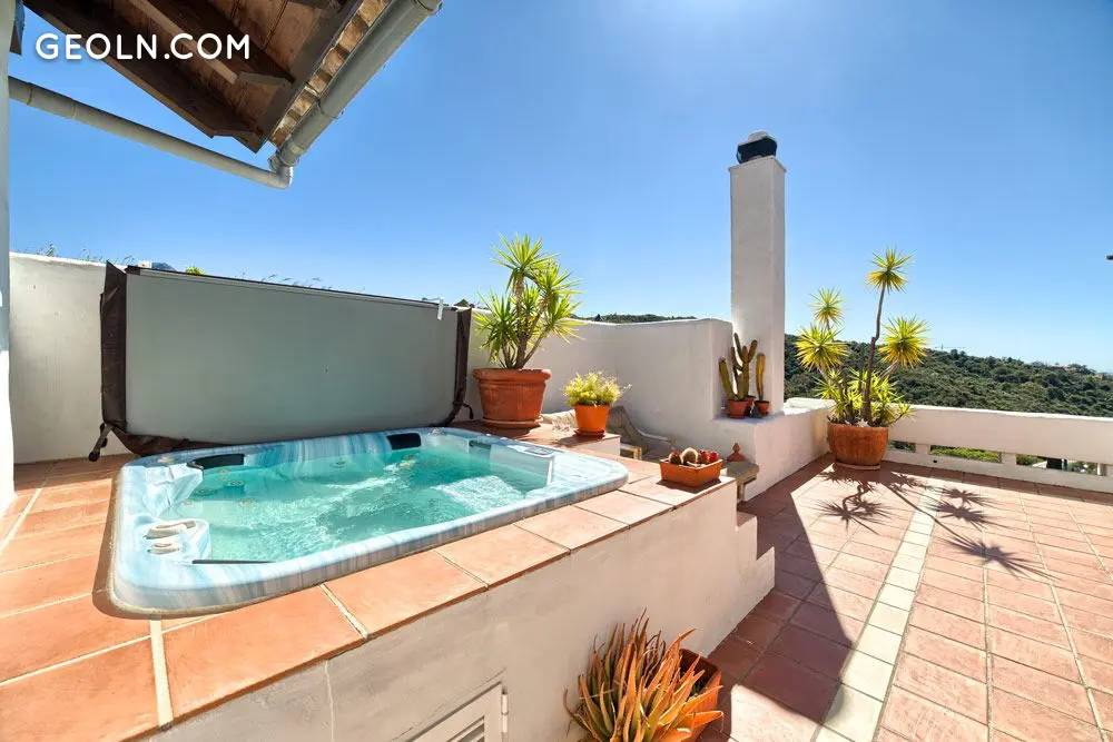 Beautiful, spacious and bright corner penthouse. South facing, with great views of the sea, mountains and golf. Quiet and private complex.Main floor: large living room with fireplace and fully equipped kitchen. Direct access to several spacious terraces with magnificent views. Two guest rooms. Upstairs: bedroom, large terrace with barbecue area and jacuzzi.