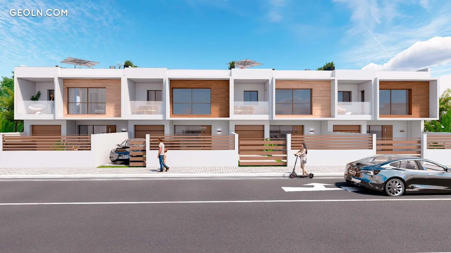 Eucalipto — is a complex of 4 semi-detached houses with swimming pool, 3 bedrooms and 3 bathrooms, located in Los Alcazares, a privileged location on the Costa Calida, allowing you to enjoy the sea and golf without giving up everything. the amenities that this area offers you. The chalets are distributed over two floors plus a solarium. On the ground floor there is a bedroom, a living room with a fitted kitchen, a bathroom, an enclosed garage with a laundry room and a terrace with a private pool. On the first floor we find two double bedrooms, one of them en suite, and a large terrace with summer kitchen and access to the solarium. All houses come with a fitted kitchen equipped with electrical appliances, pre-installation of ducted air conditioning, a security door, PVC windows, aerothermal energy, stoneware flooring and OSbroadcasting, among other things. Want more information? Contact Sunnier Homes!