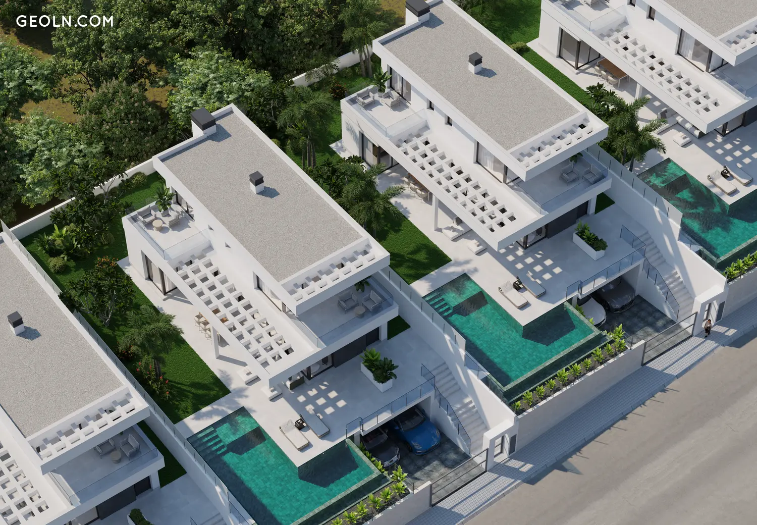 The villa’s south-facing main facade is designed with expansive floor-to-ceiling windows that fill the space with natural light throughout the day. The extensive pergolas offer an exceptional outdoor living experience, perfect for enjoying the Spanish lifestyle. These outdoor spaces seamlessly extend the indoor areas, creating a harmonious blend between inside and out.