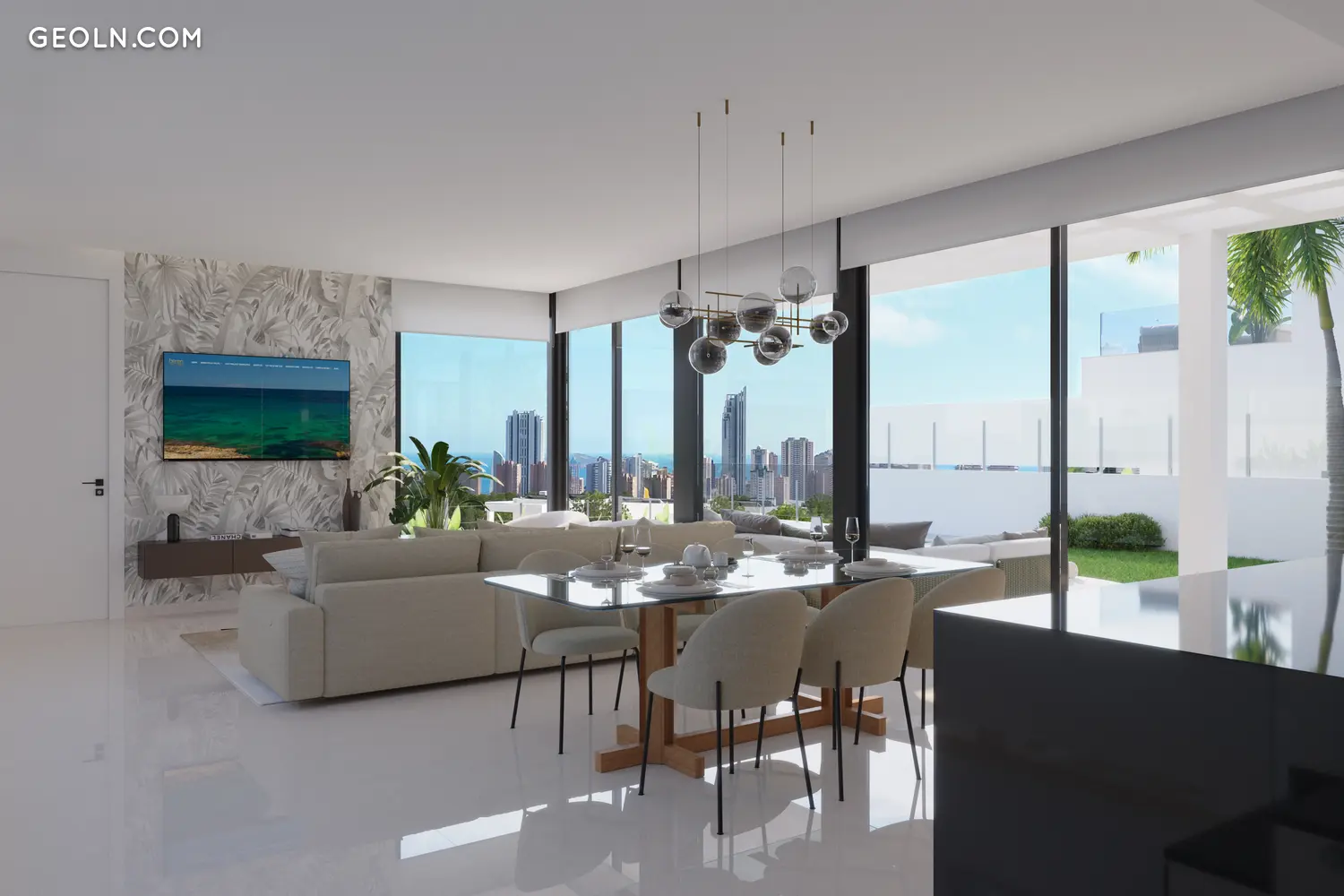This exclusive, newly built detached villa is nestled in one of the most sought-after areas of Sierra Cortina, offering stunning panoramic views of the surrounding park and the Mediterranean Sea in the distance. Located just 5 minutes from Benidorm and 3 minutes from La Marina Shopping Centre, this villa is situated in a unique setting, surrounded by the natural beauty of the sea, lush pine forests, and mountainous landscapes.