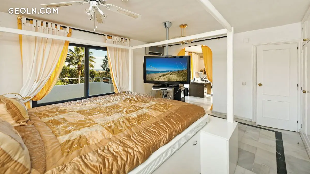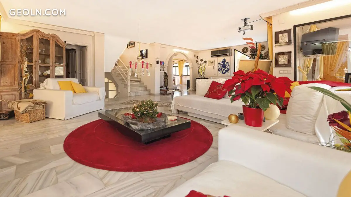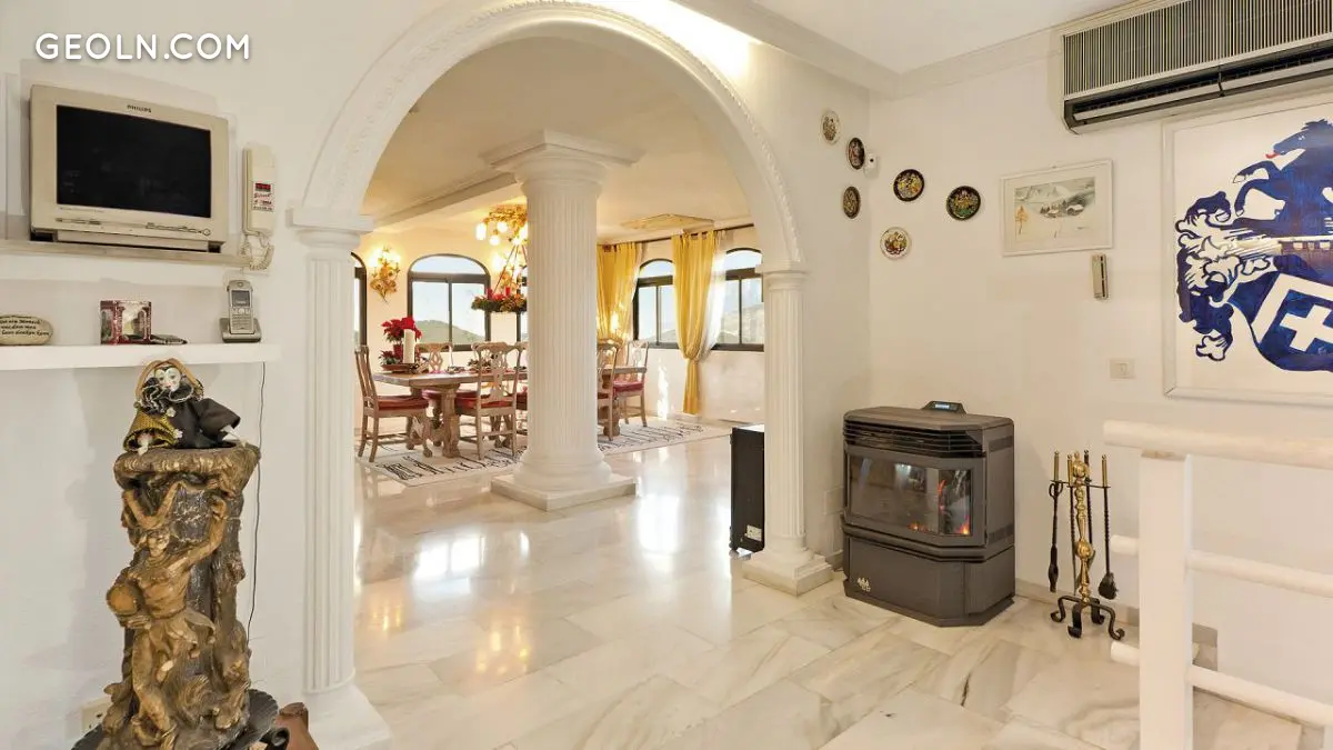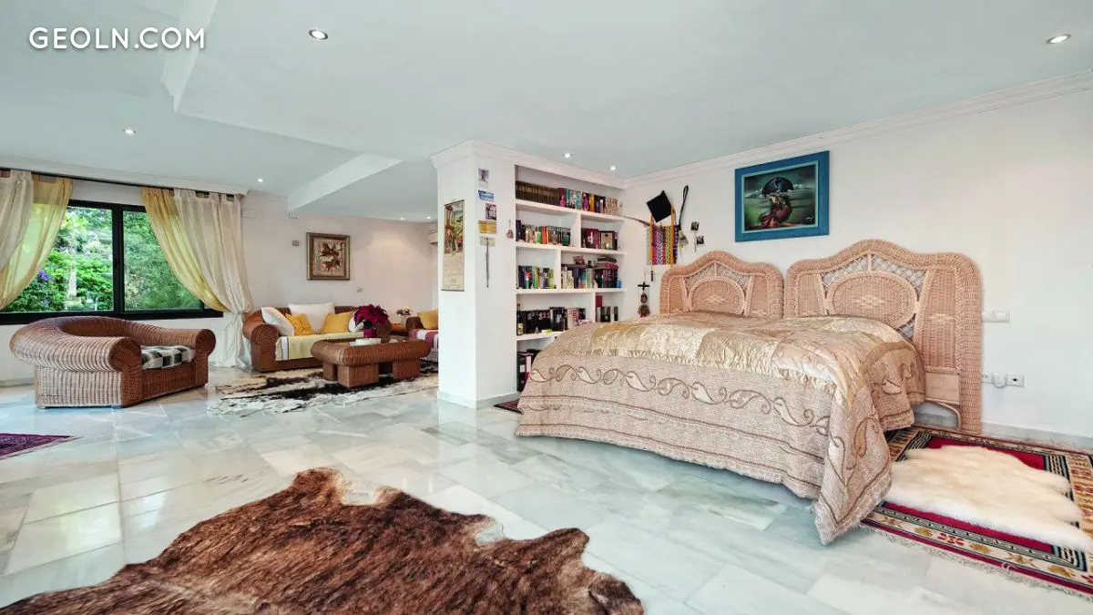 Spacious east-facing villa located on a plot of approximately 1558 m². Family house with sea views in Nueva Andalucia is located on three floors. The built-up area of about 466 m² has 5 bedrooms, 4 bathrooms, a spacious living room with a fireplace, a dining room, a large kitchen, various terraces and a swimming pool.On the second floor there is a fully equipped kitchen with a separate dining area, a living room with access to the terraces, as well as a swimming pool. There is also a spacious bedroom with a bathroom on this floor.