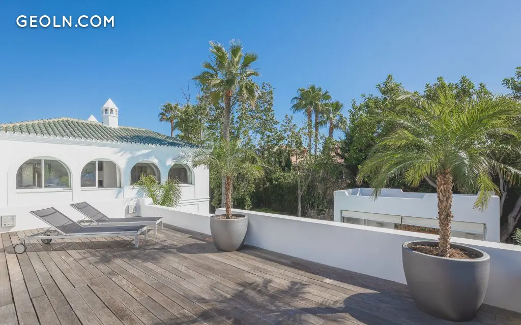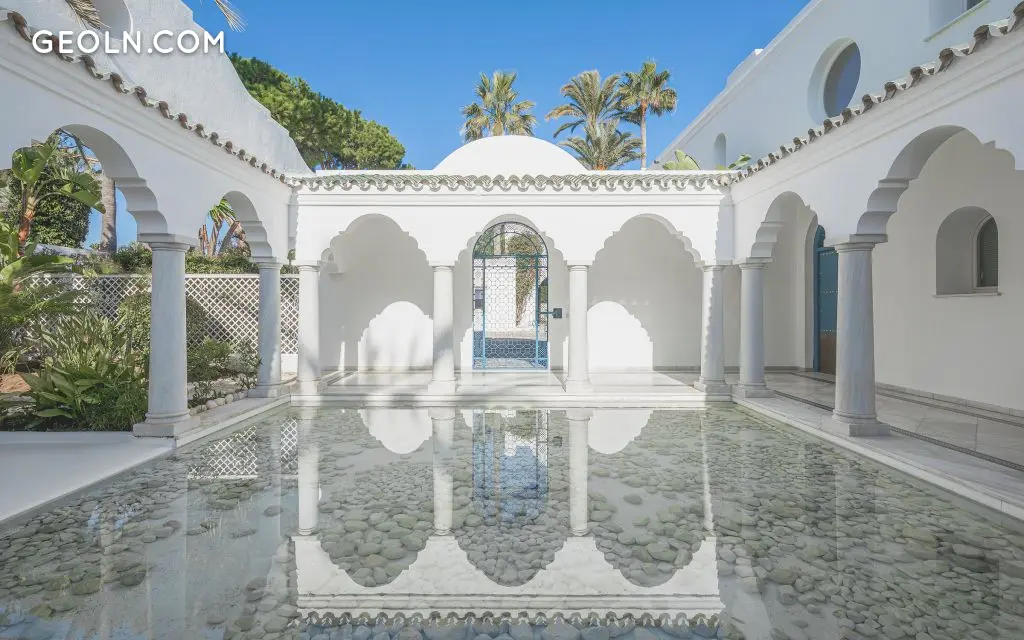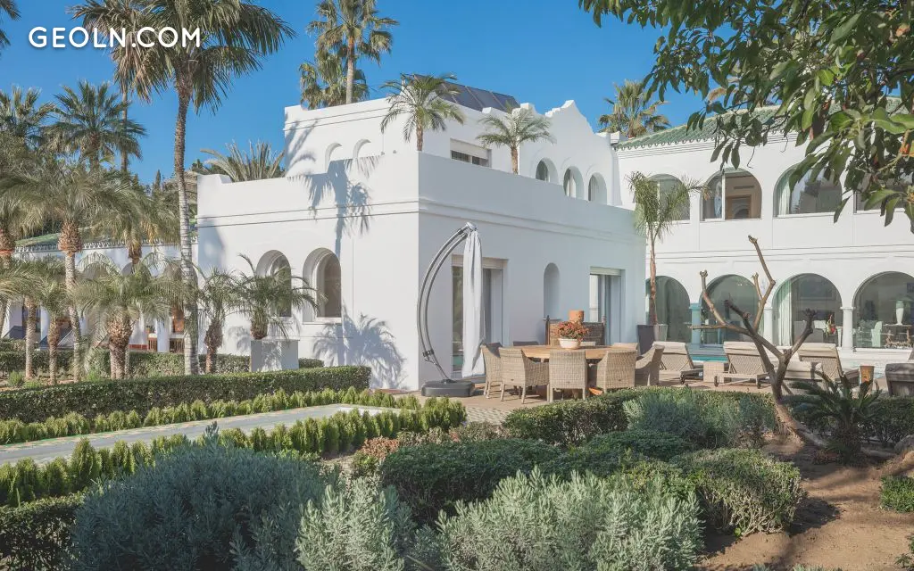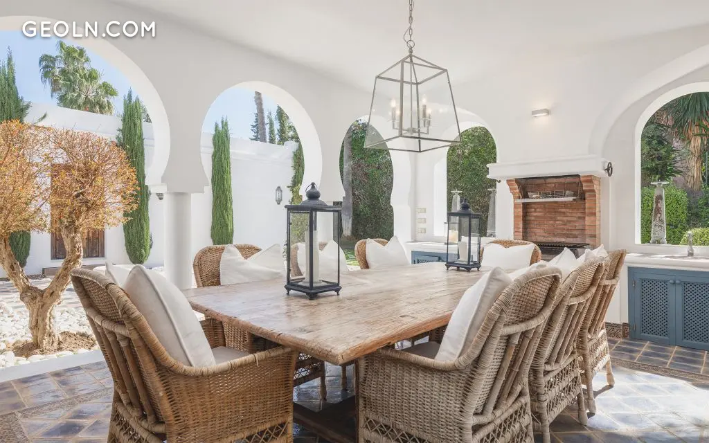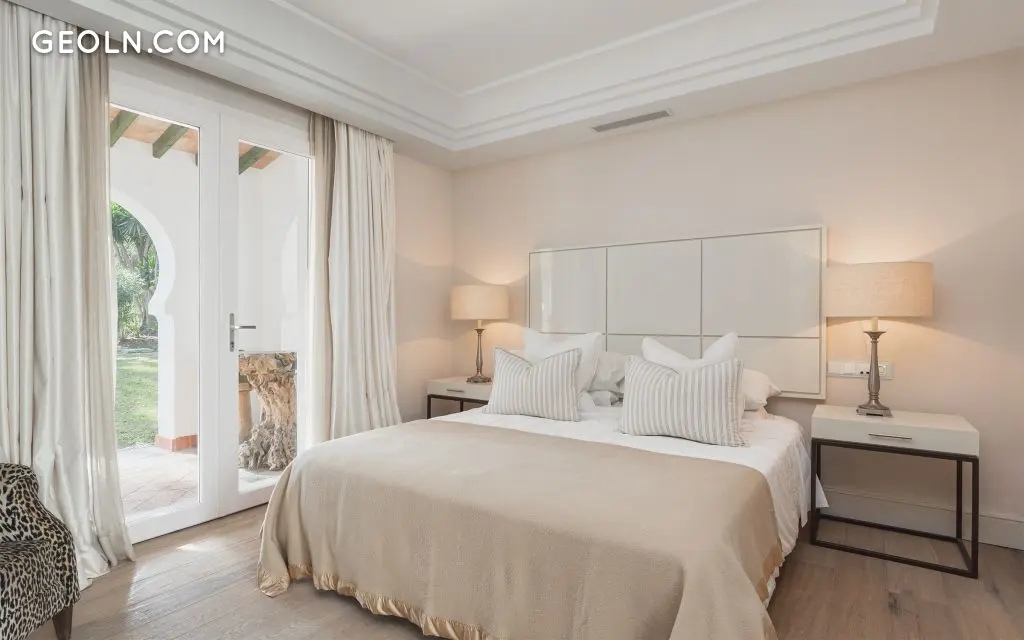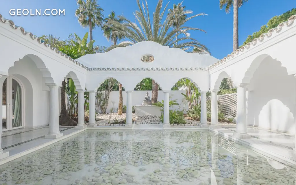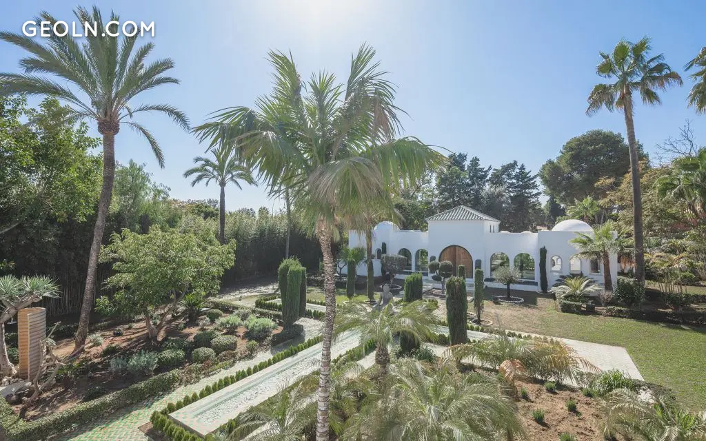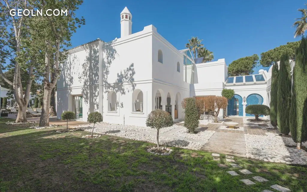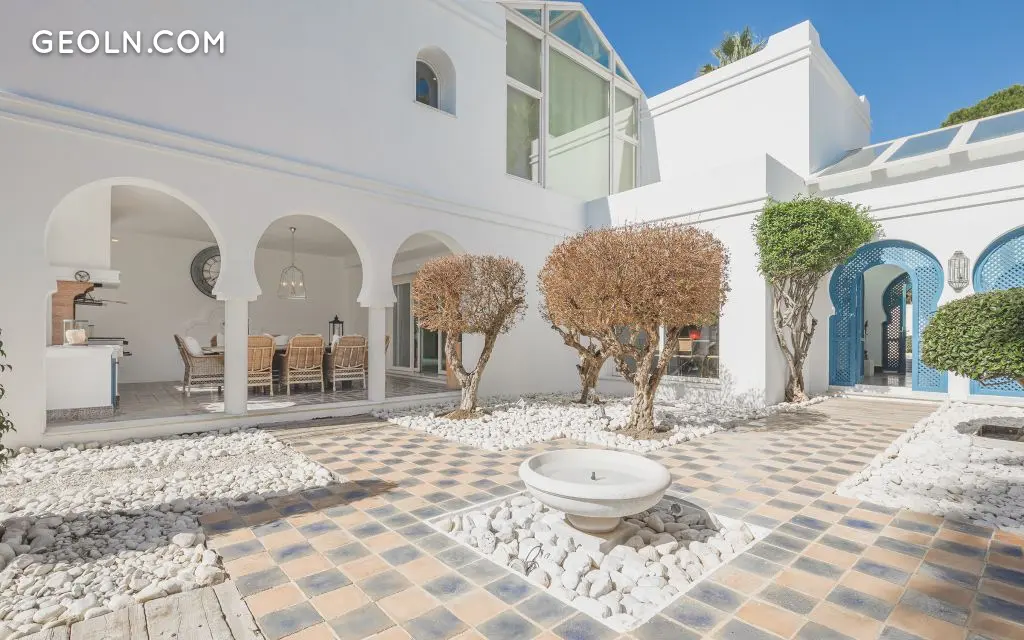 VILLA IN GUADALMINA BAJA, SAN PEDRO DE ALCANTARA Exquisite Andalusian Moorish style villa in Guadalmina Baja, an exclusive residential area located just a few meters from the beach and the Guadalmina Spa Golf Resort. Antique wooden doors lead to a patio with a fountain and a driveway with a carport and additional parking space. We are immediately greeted by an imposing double-height hall with a guest toilet leading to a huge living room divided into several seating areas and a cinema room with a guest toilet among them; canteen; fully equipped kitchen with top quality appliances; 3 double bedrooms for guests with bathrooms; an additional guest bedroom currently used as an office; veranda with dining area and barbecue area; access to the swimming pool with terrace, sun loungers and covered seating area. On the first floor: an impressive 150 m2 master suite with a separate sitting area, fireplace, two walk-in closets and a magnificent bathroom divided into two separate areas and with a free-standing bathtub; further bedroom with bathroom with access to a large terrace with sun loungers. Indoor Pavilion: Large heated indoor pool with seating area. Next to the entrance: separate staff apartment with bedroom and bathroom. Garage for two cars. The villa is located on a large plot surrounded by gardens, palm trees and crystal clear water inspired by Andalusian Moorish motifs, a real joy to the senses. Very private villa in one of the most prestigious residential areas of Marbella, in a quiet location, close to all amenities and the beach.