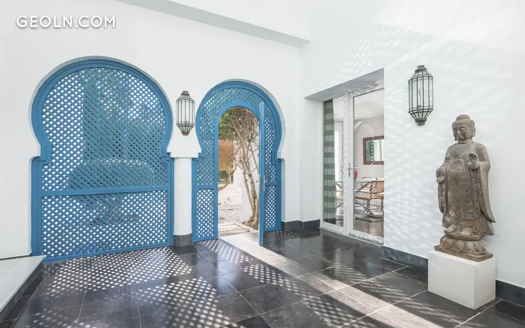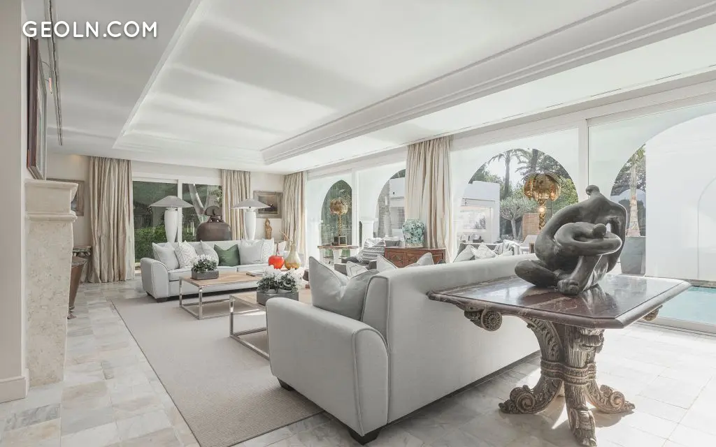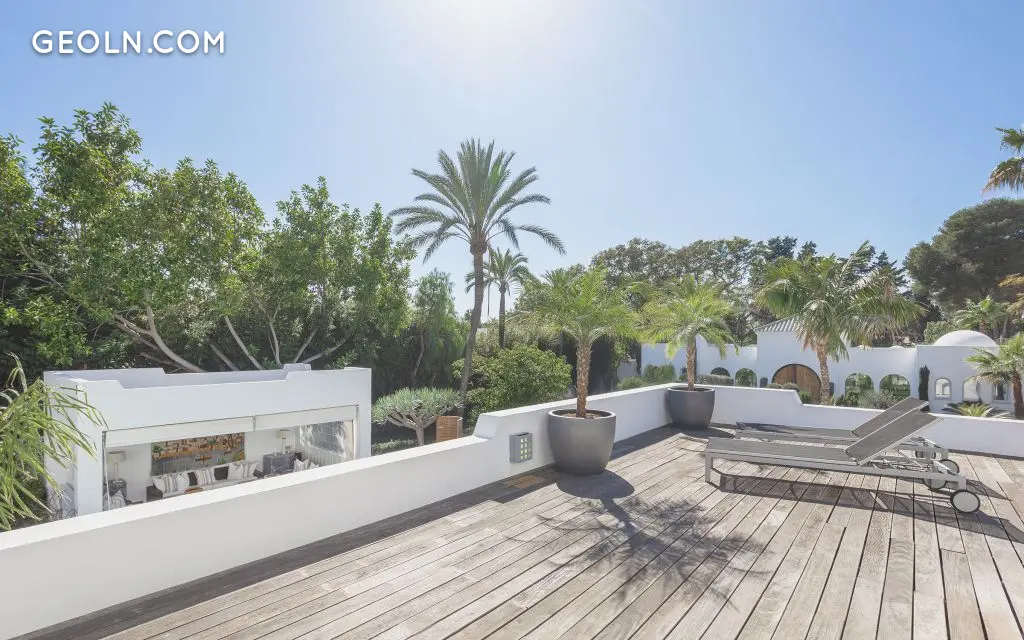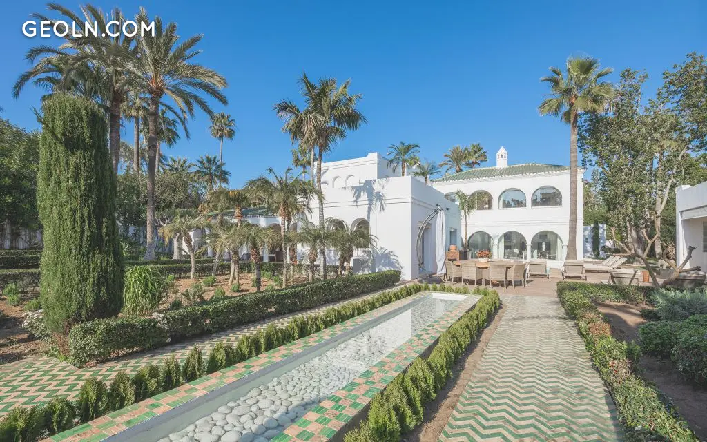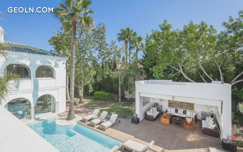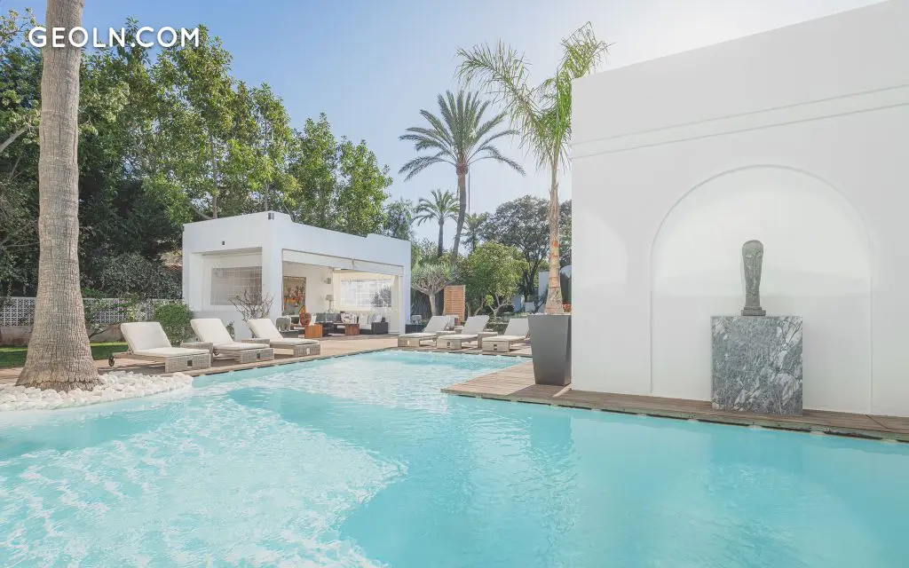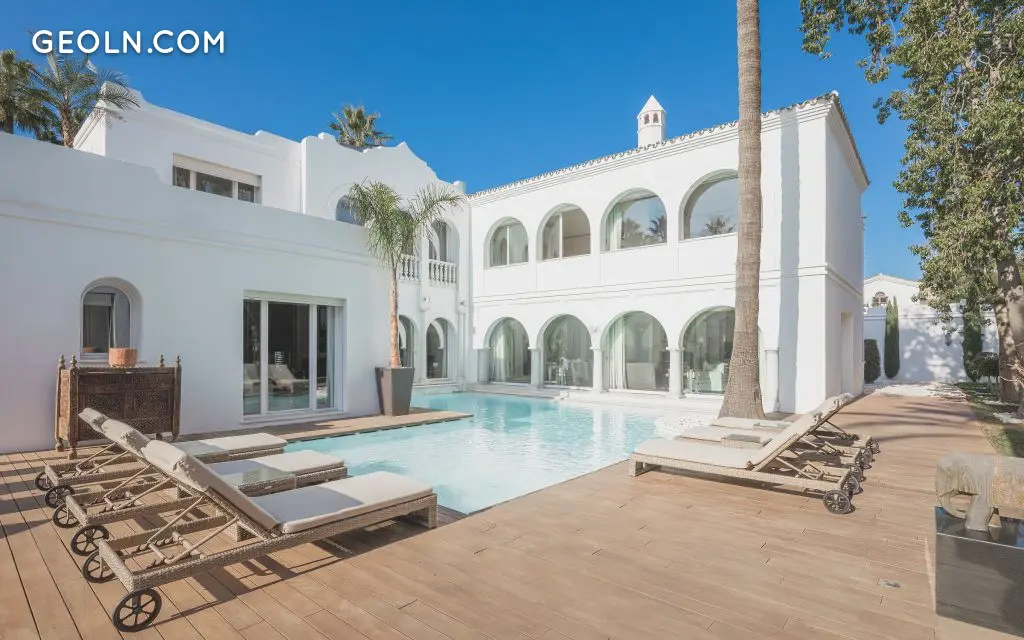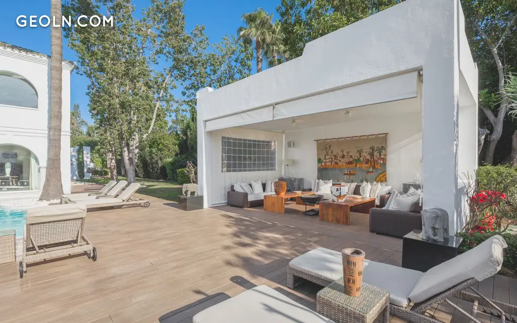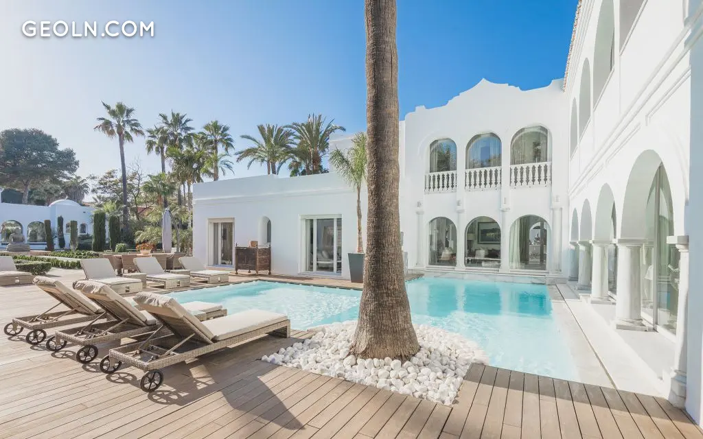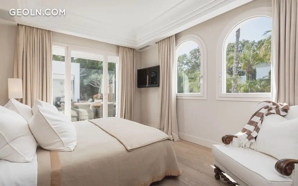 VILLA IN GUADALMINA BAJA, SAN PEDRO DE ALCANTARA Exquisite Andalusian Moorish style villa in Guadalmina Baja, an exclusive residential area located just a few meters from the beach and the Guadalmina Spa Golf Resort. Antique wooden doors lead to a patio with a fountain and a driveway with a carport and additional parking space. We are immediately greeted by an imposing double-height hall with a guest toilet leading to a huge living room divided into several seating areas and a cinema room with a guest toilet among them; canteen; fully equipped kitchen with top quality appliances; 3 double bedrooms for guests with bathrooms; an additional guest bedroom currently used as an office; veranda with dining area and barbecue area; access to the swimming pool with terrace, sun loungers and covered seating area. On the first floor: an impressive 150 m2 master suite with a separate sitting area, fireplace, two walk-in closets and a magnificent bathroom divided into two separate areas and with a free-standing bathtub; further bedroom with bathroom with access to a large terrace with sun loungers. Indoor Pavilion: Large heated indoor pool with seating area. Next to the entrance: separate staff apartment with bedroom and bathroom. Garage for two cars. The villa is located on a large plot surrounded by gardens, palm trees and crystal clear water inspired by Andalusian Moorish motifs, a real joy to the senses. Very private villa in one of the most prestigious residential areas of Marbella, in a quiet location, close to all amenities and the beach.