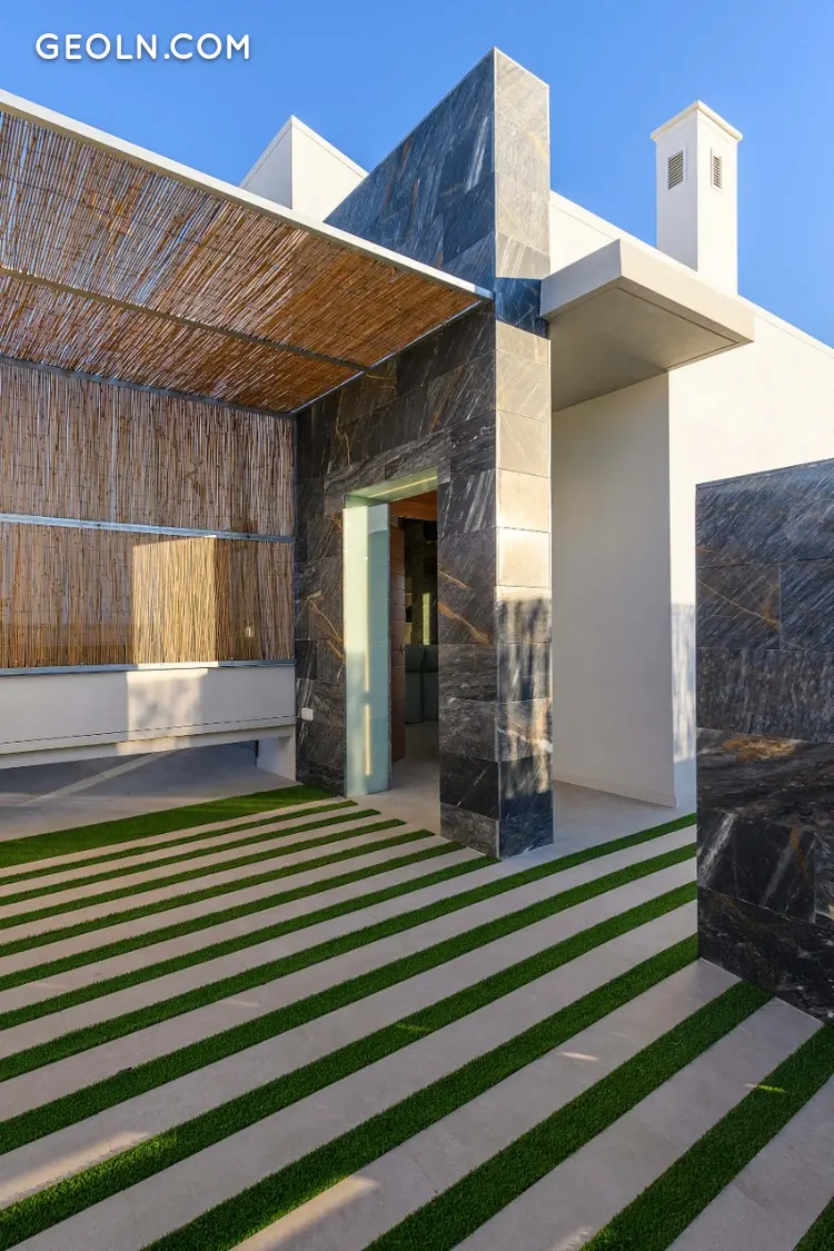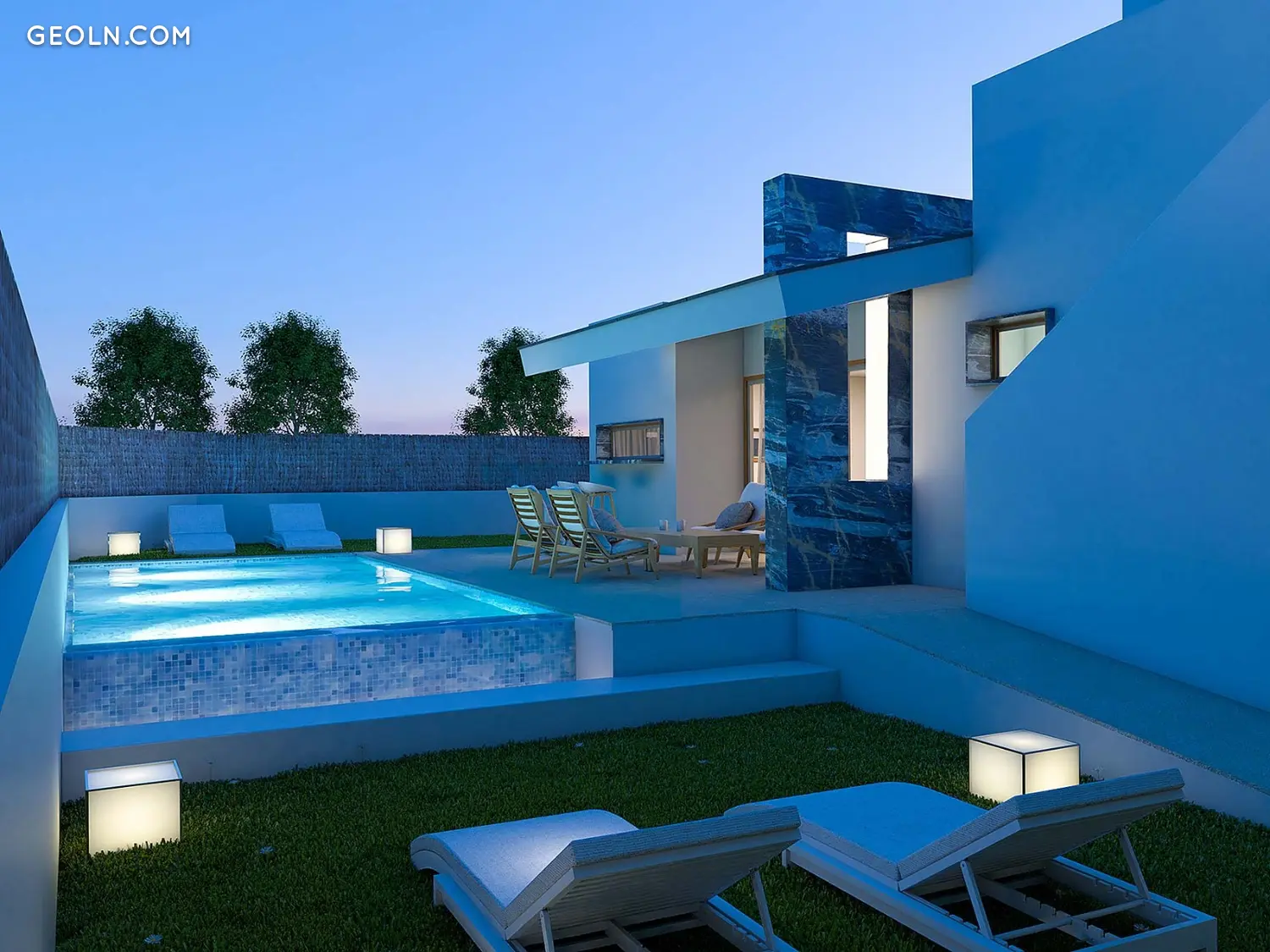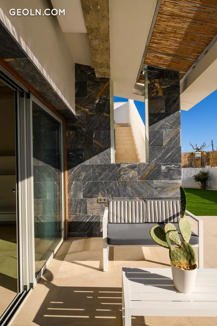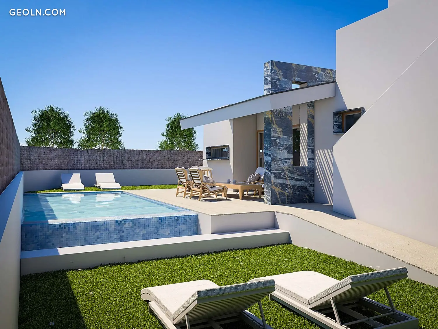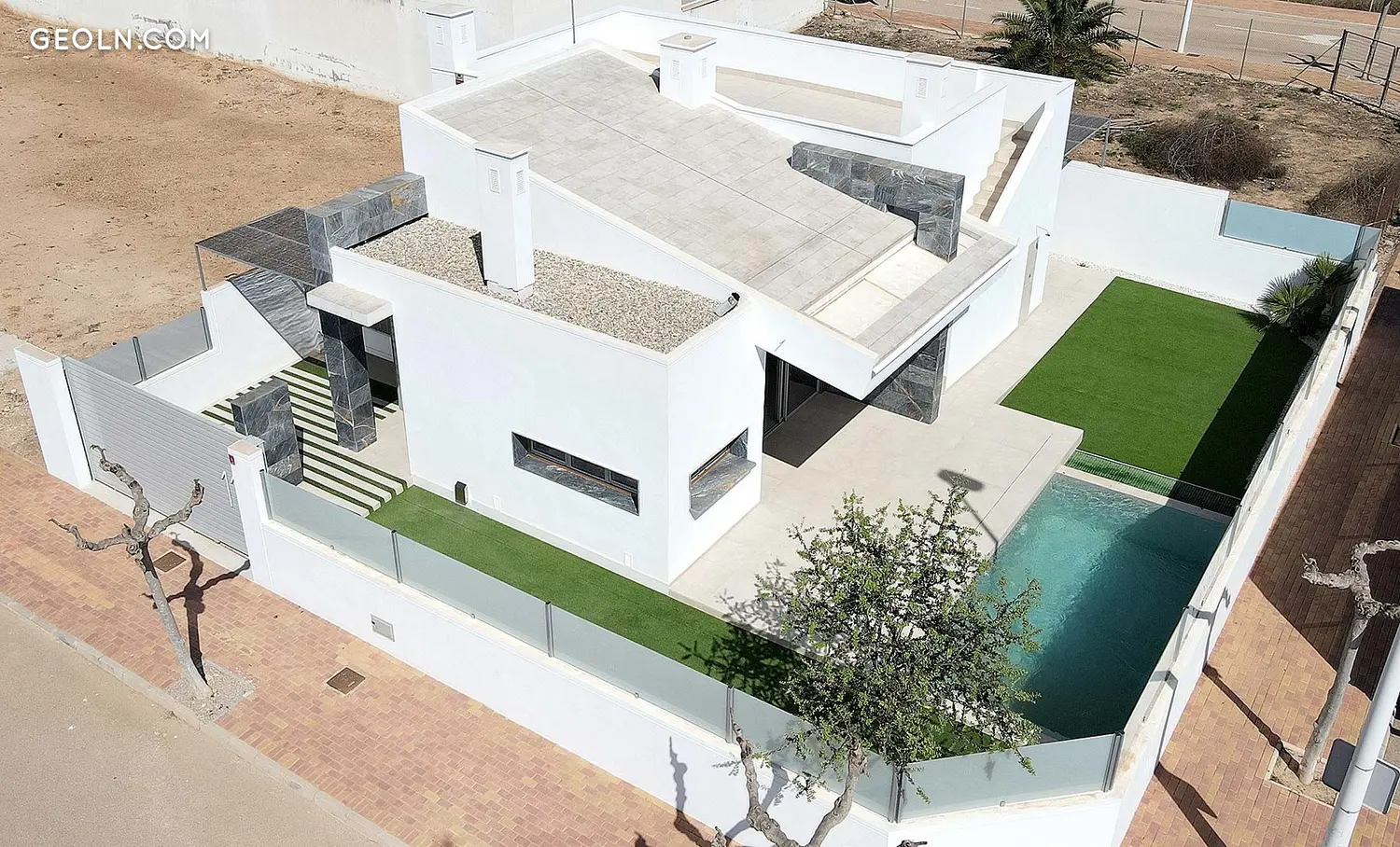 Sunset Premium Villas is a collection of detached villas on one floor located on the Costa Cálida, in San Pedro del Pinatar. The villas are distributed over 3 bedrooms with 2 bathrooms and a spacious living room with built-in kitchen, very bright thanks to the windows that give access to the garden. It also has a private solarium, porch and private swimming pool. The houses come with a fitted kitchen equipped with electrical appliances, ducted air conditioning, aluminum windows with electric shutters, indoor and outdoor lighting, aerothermal energyher, etc. Need more information? Contact Sunnier Homes!