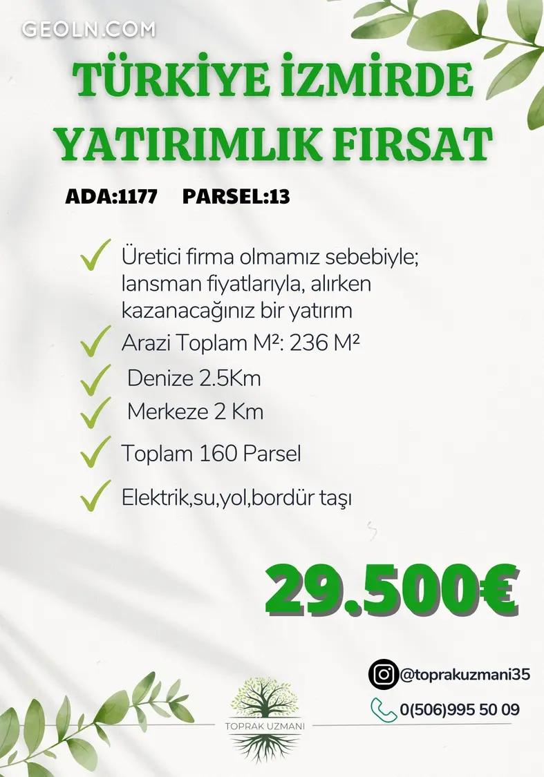 -İzmir Özdere is one of the most popular holiday destinations in İzmir. In our site, which has a total of 160 parcels, we offer a project that provides 236 m² of usable area per parcel, including electricity, road, and water facilities. Each parcel is provided as raw land, and you can build your house as you wish on it. If you want, we can also provide support in building your house. You won't want to miss our project, which is an ENORMOUS opportunity for investment. "These areas will appreciate greatly."